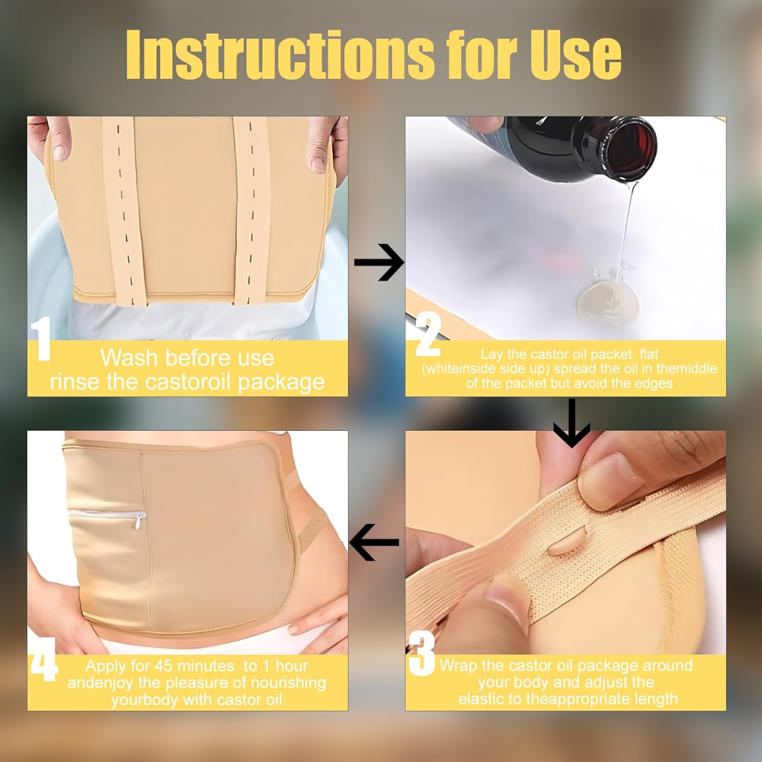Ricinusolie-packset: de ricinusolieverpakking bevat een tailleverpakking, een nekverpakking, een waszak, een waterdichte doek en een kleverige elastiek. Om het vuil van kleding of lakens te voorkomen, kun je ricinusolie op het extra zeil gieten en de ricinusoliepleisters dragen