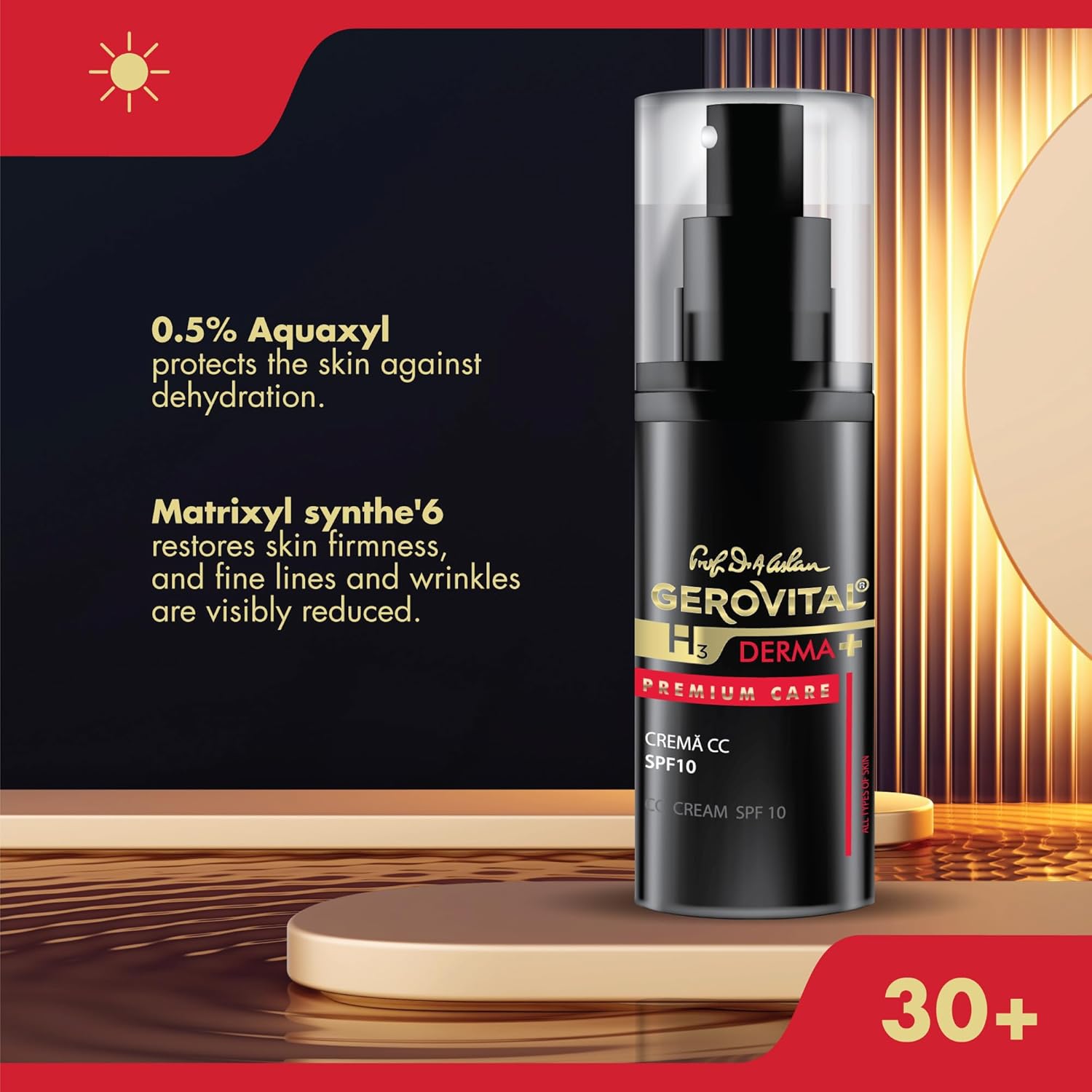 Gerovital H3 Derma+ Premium Care CC Cream SPF 10 is een veelzijdig cosmetisch product dat de voordelen van make-up combineert met geavanceerde huidverzorging. Deze CC crème is ontworpen voor een natuurlijke, egale teint en biedt een medium dekking om onvolkomenheden te camoufleren zonder het zware gevoel van foundation. De crème bevat anti-aging eigenschappen en UV-bescherming en verbetert de hydratatie en stevigheid voor een gezonde, jeugdige gloed. Belangrijkste kenmerken: Multifunctioneel cosmetisch product: Combineert de voordelen van make-up en huidverzorging, biedt medium dekking en anti-aging effecten. Lichte textuur: Biedt een natuurlijke uitstraling zonder het maskerachtige effect van foundation. Medium tint: Past zich aan verschillende huidtinten aan voor een naadloze, natuurlijke look. SPF 10 Bescherming: Beschermt de huid tegen schadelijke UV-stralen tijdens korte blootstelling aan de zon. Voordelen: Egale huidtint: Corrigeert en egaliseert de huidskleur voor een egale, vlekkeloze teint. Medium dekking: Camoufleert onvolkomenheden van de huid met behoud van een natuurlijke uitstraling. Hydratatie en stevigheid: Verhoogt de hydratatie en stevigheid van de huid, voor een jeugdige uitstraling. Anti-rimpelwerking: Samengesteld met anti-aging ingrediënten om fijne lijntjes te verminderen. UV-bescherming: Biedt SPF 10 bescherming tegen huidbeschadiging door UV-straling. Bewezen efficiëntie tegen rimpels: Klinische studies van Sederma hebben significante resultaten aangetoond bij consistent gebruik van onze CC Cream (2 toepassingen/dag gedurende 2 maanden): – Liftend effect: Stijgt tot 77%. – Volume rimpels: Vermindert tot 100% – Maximale rimpeldiepte: Vermindert tot 62% Waarom kiezen voor Gerovital H3 Derma+ Premium Care CC Cream SPF 10? SPF 10 Bescherming: Bescherm je huid tegen schadelijke UV-stralen met ingebouwde zonnebescherming. Geen Masker Effect: Bereik een naadloze, natuurlijke look zonder het zware, cakey gevoel van foundation. Geschikt voor alle huidtypes: Of je nu een droge, vette of gemengde huid hebt, deze CC Cream past zich aan jouw behoeften aan en biedt perfecte dekking en verzorging.