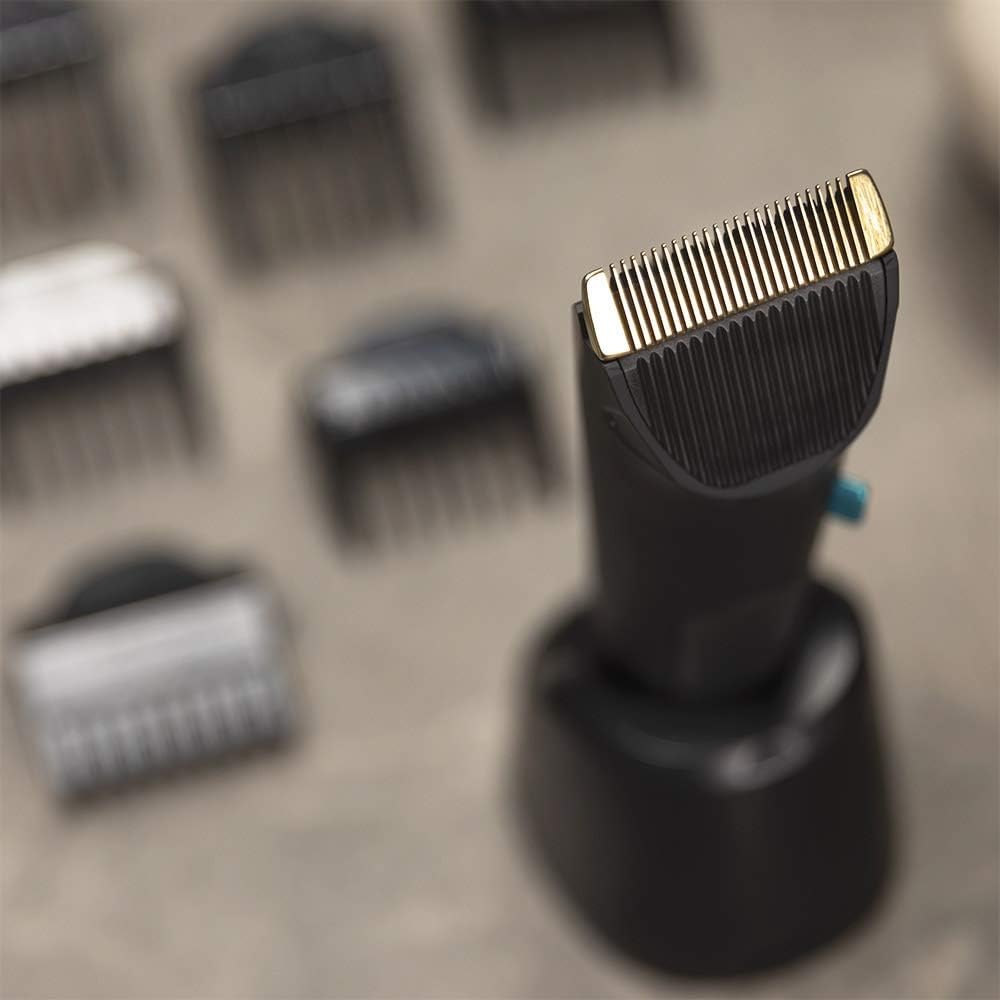Hoogwaardig titanium gecoate roestvrijstalen lemmet voor hardheid, sterkte en langdurige slijpen. Lithiumbatterij met een batterijduur van maximaal 120 minuten tussen de opladingen. IPX6: tondeuse beschermd tegen hogedrukstralen. Verschillende lengtes van 0,5 tot 30 mm voor een perfecte afwerking. Hij heeft 8 kammen. 7 geleidekammen van 3, 4-6 mm, 7-9 mm, 10-12 mm, 16-18 mm, 22-24 mm en 28-30 mm en een gradiëntkam. Non-stop functie: maakt draadloos en bekabeld gebruik mogelijk. Wasbare en verwijderbare messen voor eenvoudig onderhoud van het LED-display van de tondeuse met oplaadindicator, zowel om te weten hoe lang het duurt om te gebruiken als om te weten hoeveel lading er is opgebouwd, en de vergrendelingsfunctie is geactiveerd.