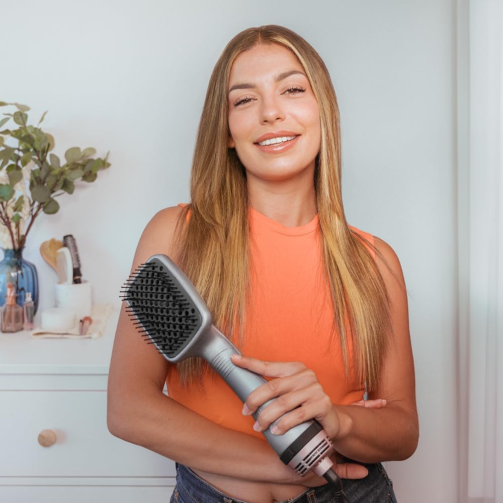 3-in-1: geniet van 3 functies in één product dankzij de vorm van de vierkante kop: drogen, ontwarren en gladmaken. Droog: deze luchtborstel droogt je haar snel, vermindert de droogtijd en maakt je haar klaar voor de dag. Ontward: de borstelharen van de vierkante borstel ontwarren zachtjes elke streng en verwijderen moeiteloos knopen en klitten. Neem afscheid van het trekken en verwelkom een zachte ontwarring. Gladend: ontworpen om subtiele gladheid te bieden, verwijdert deze luchtborstel natuurlijke haargolven en zorgt voor een zachte en natuurlijke styling. Het is geen strijkijzer, maar het geeft je de vleugje polijsten en gladmaken die je nodig hebt.