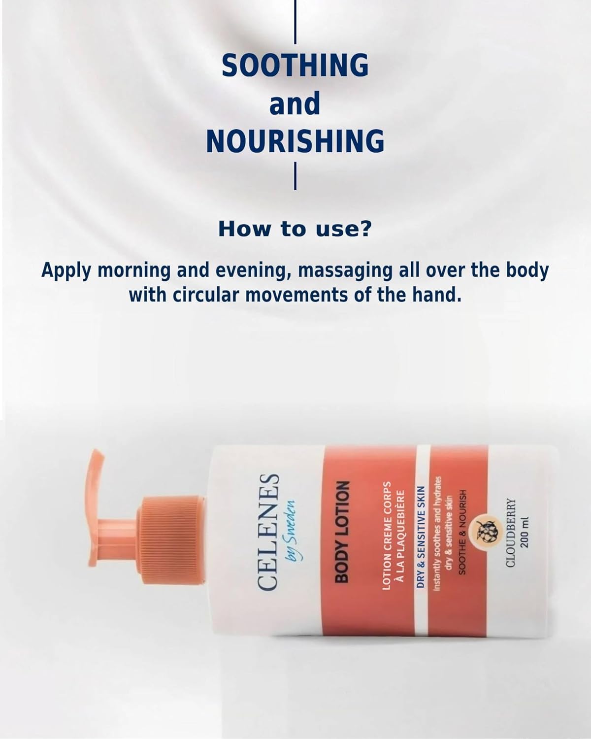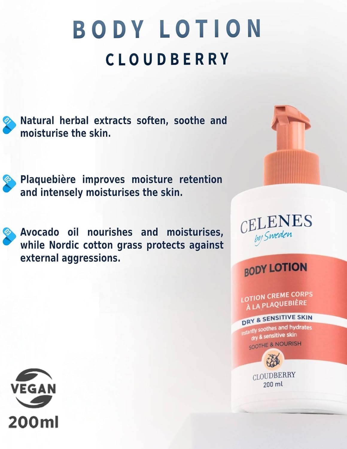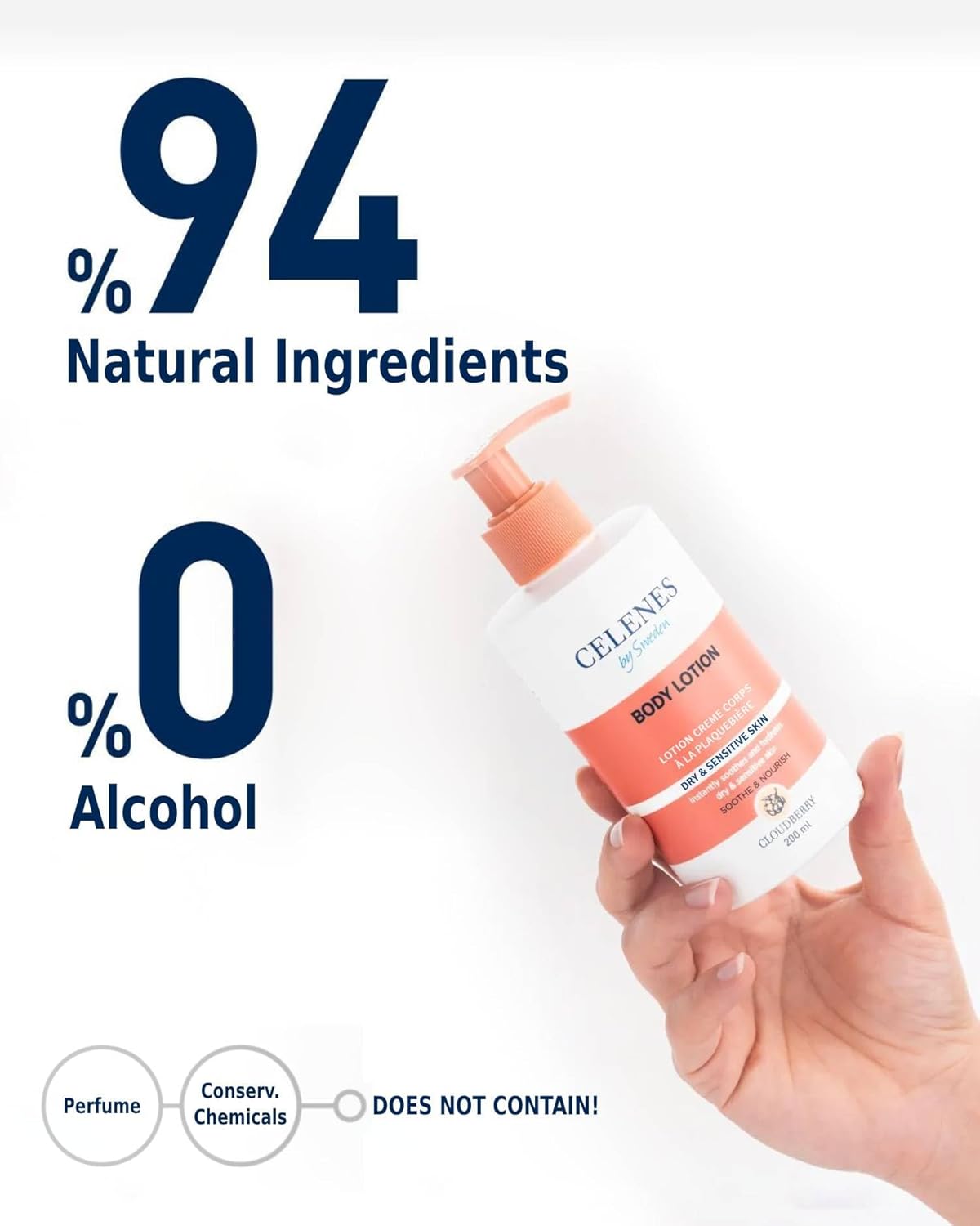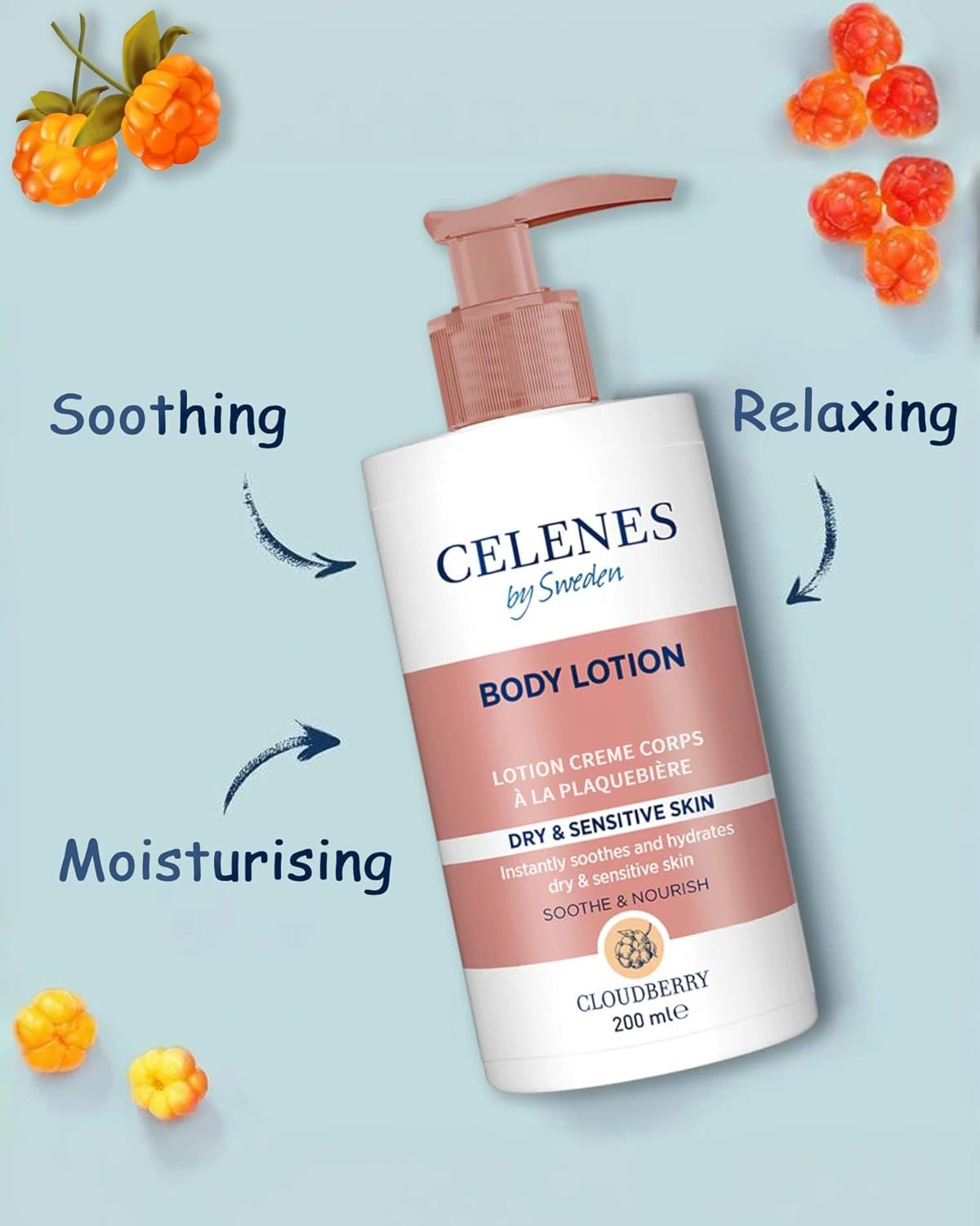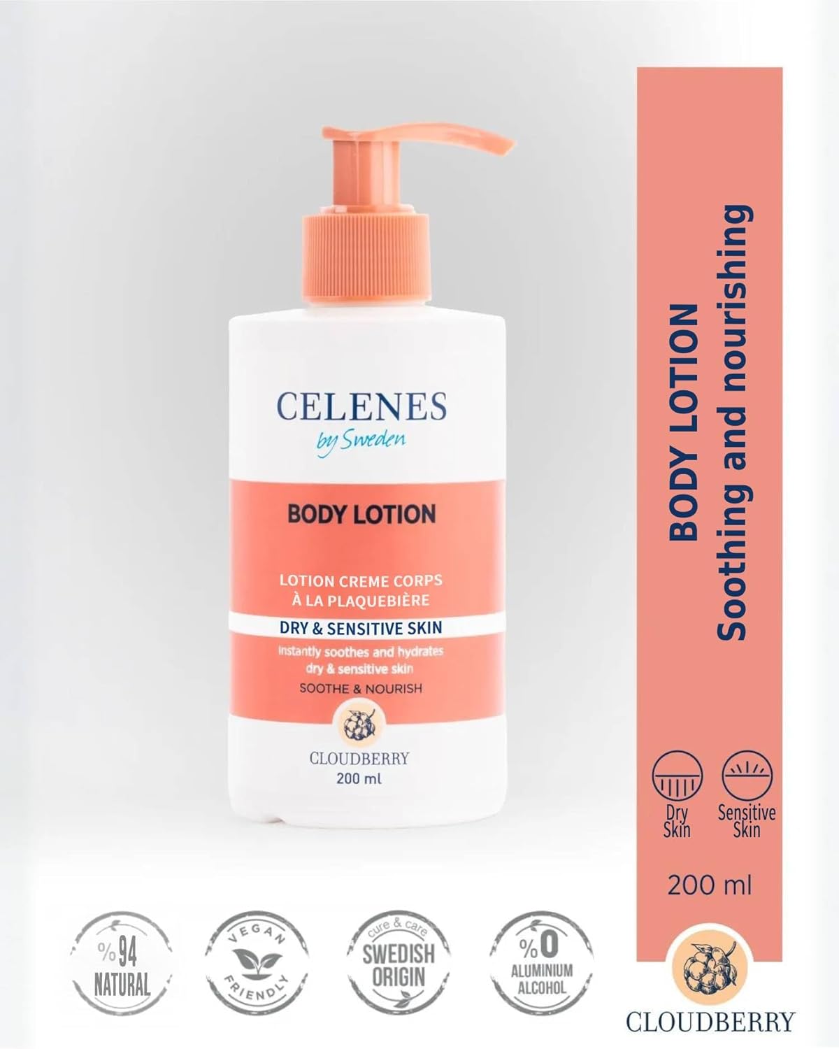 Geniet van de luxe verzorging met de Celenes by Sweden Cloudberry Body Lotion, met zorg vervaardigd in Zweden voor mensen met een droge en gevoelige huid.