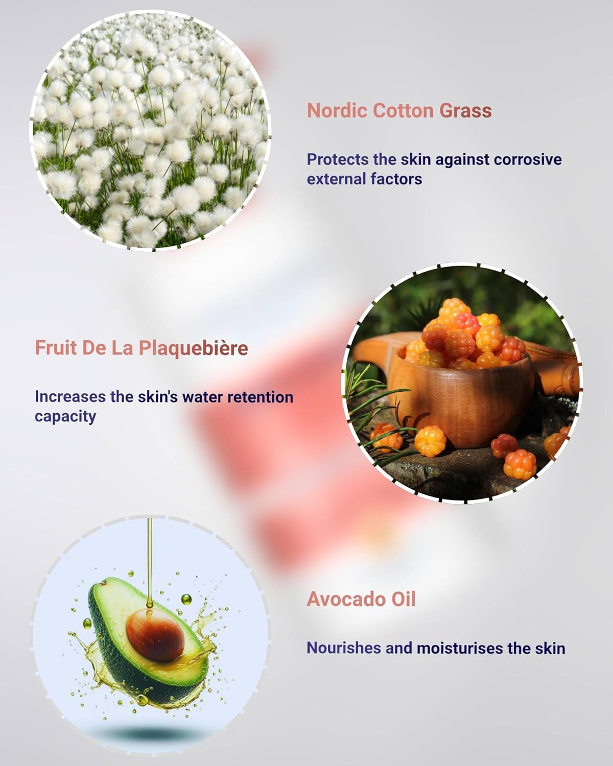 Robuuste milieubescherming: Doordrenkt met Scandinavisch katoengras, biedt deze lotion een beschermend schild dat effectief de huid beschermt tegen milieuvervuilers en schurende factoren zoals wind en temperatuurextremen. Deze barrière helpt schade en irritatie te voorkomen, waardoor uw huid gezond en veerkrachtig blijft in uitdagende omstandigheden.