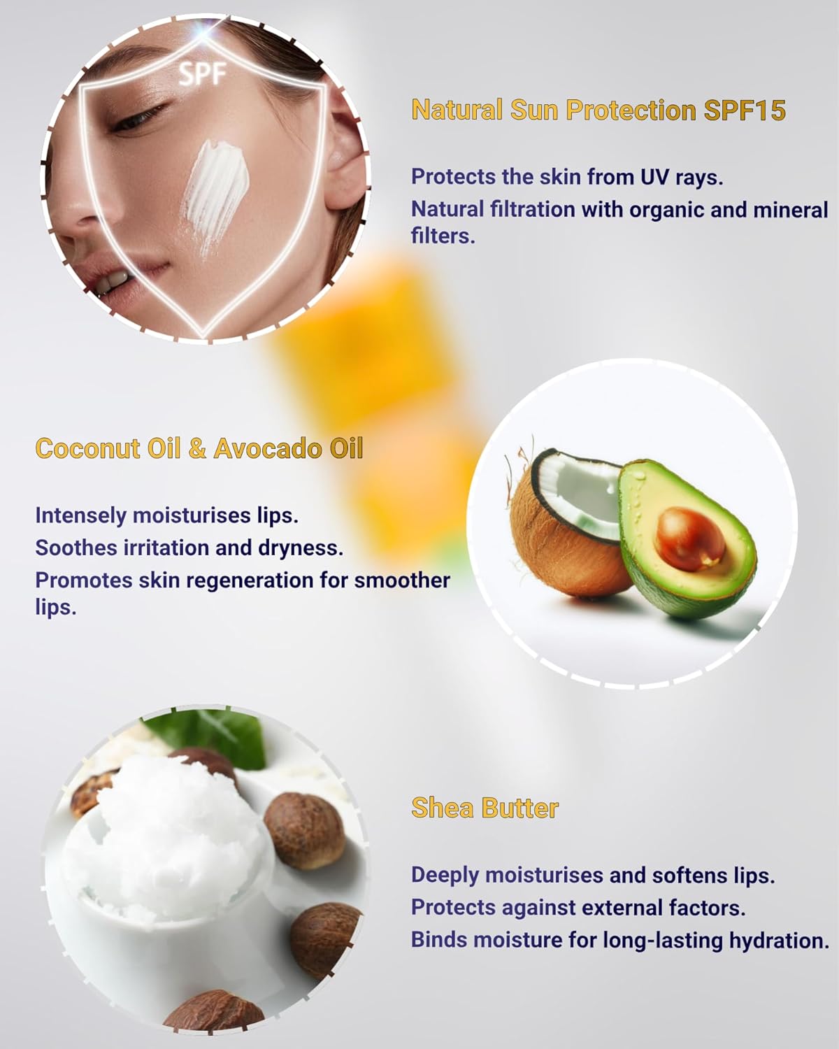 ☀️ SPF 15 Zonbescherming: Onze lippenbalsem biedt SPF 15 bescherming tegen de zon om je lippen optimaal te beschermen tegen schadelijke UV-stralen. Dit is niet zomaar een lippenbalsem maar een geavanceerde verzorging die fungeert als een natuurlijk schild tegen verbranding en langdurige schade. Ideaal voor dagelijks gebruik om je lippen gezond en stralend te houden.