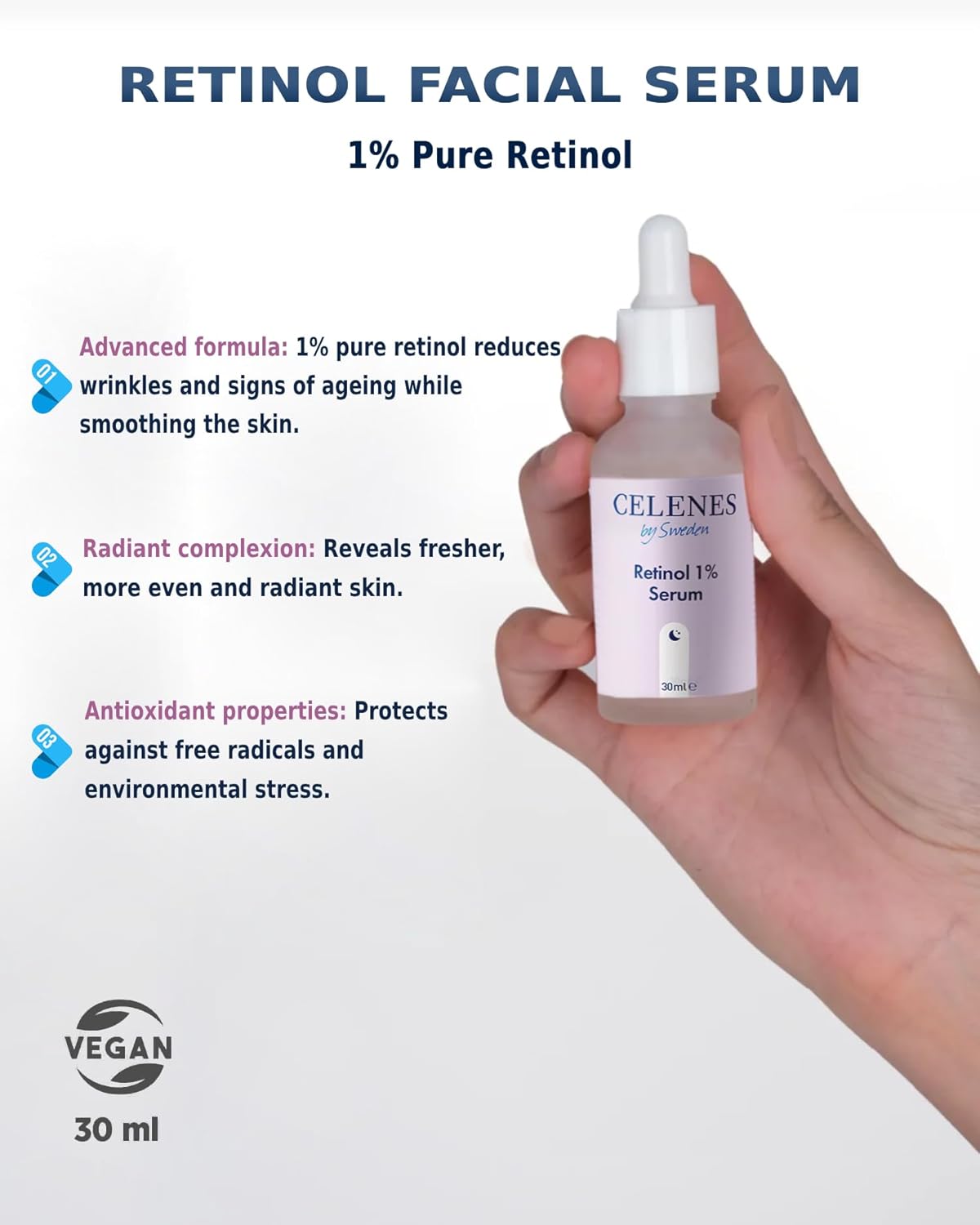 Celenes By Sweden Retinol 1% Anti-Aging Gezichtsserum – Watervrije Formule tegen Fijne Lijnen, Rimpels en Oneffen Huidtinten – Vegan, Collageen Versterkende Huidverzorging voor een Stralende Teint
