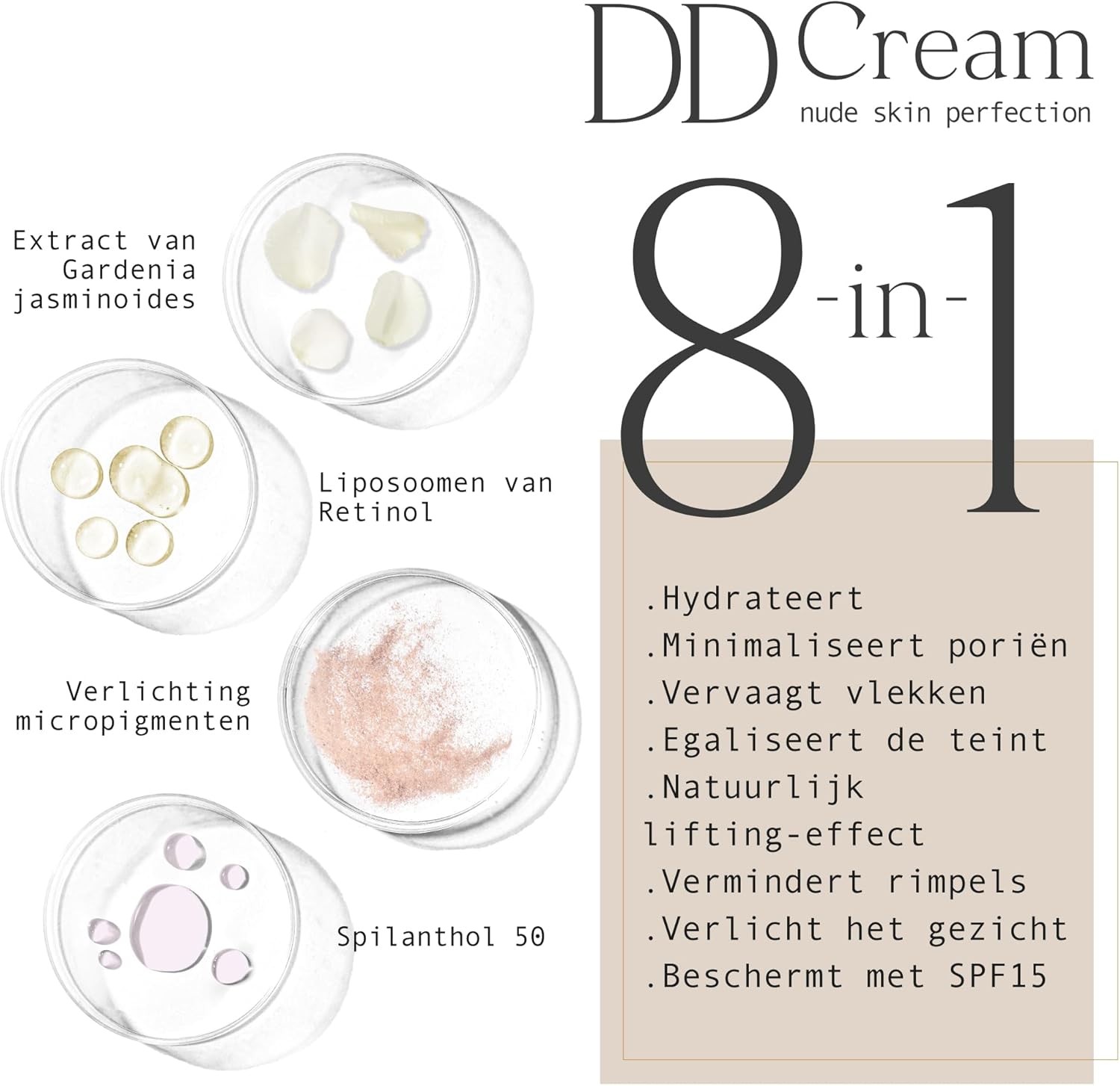 Resultaten 8-in-1: Hydrateert, Minimaliseert Porën, Vermindert vlekken, Egaliseert de teint, Natuurlijk Lifting Effect, Vermindert Rimpels, Verlicht het Gezicht en Beschermt met SPF 15.