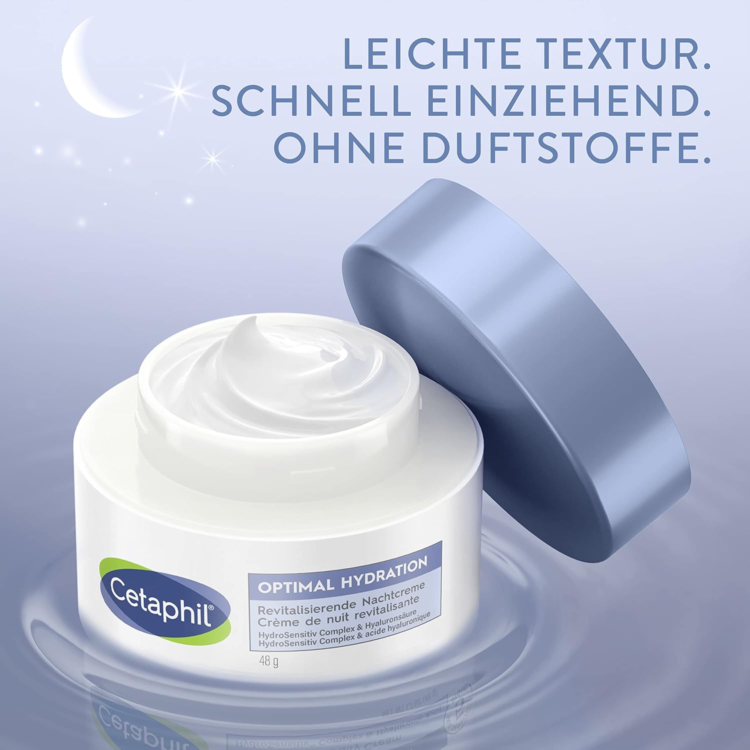 Hydrateert volledig met de huidverzachtende blauwe dag en hydraterende glycerine: activeert het dynamische hydratatieproces van de gevoelige huid tijdens de slaap.
