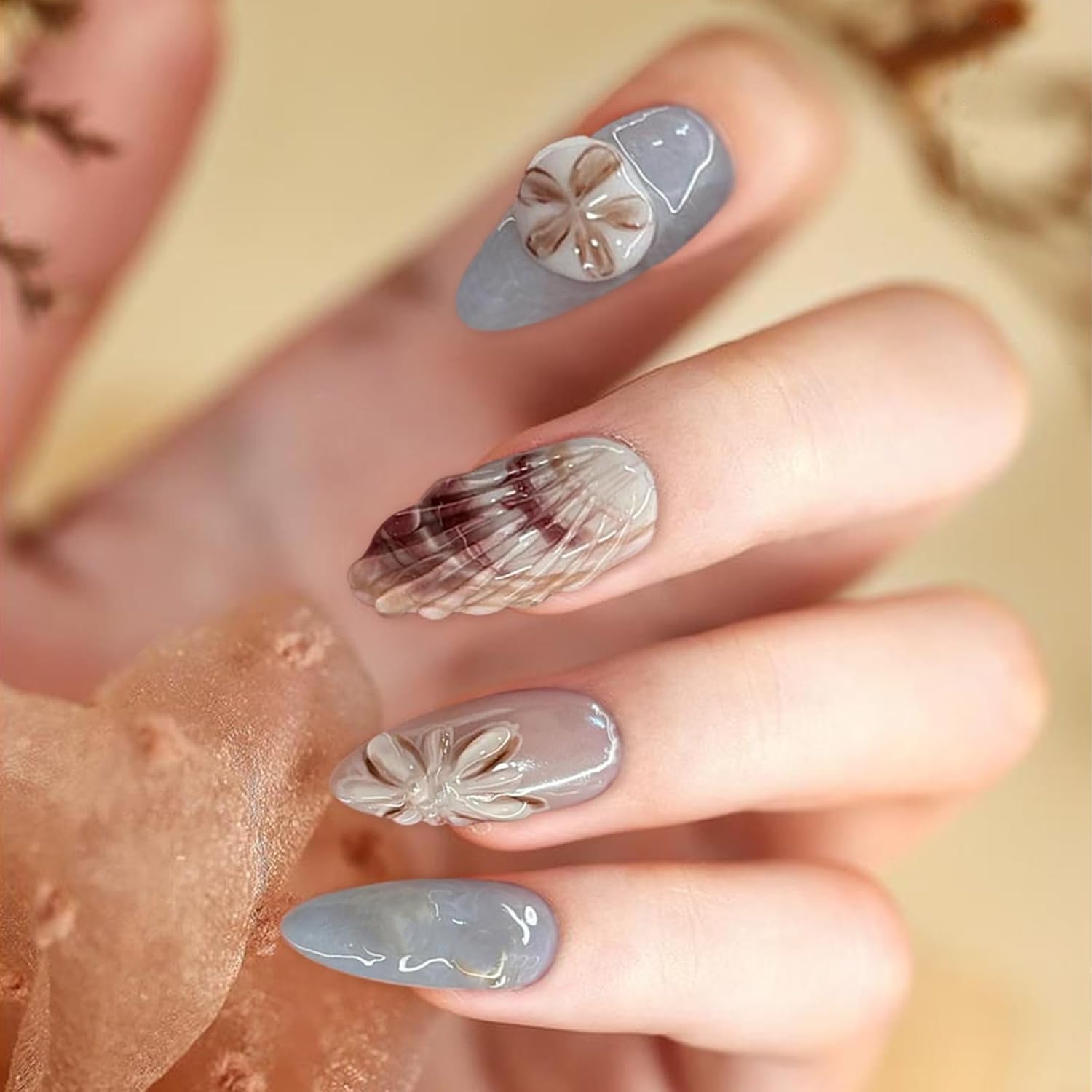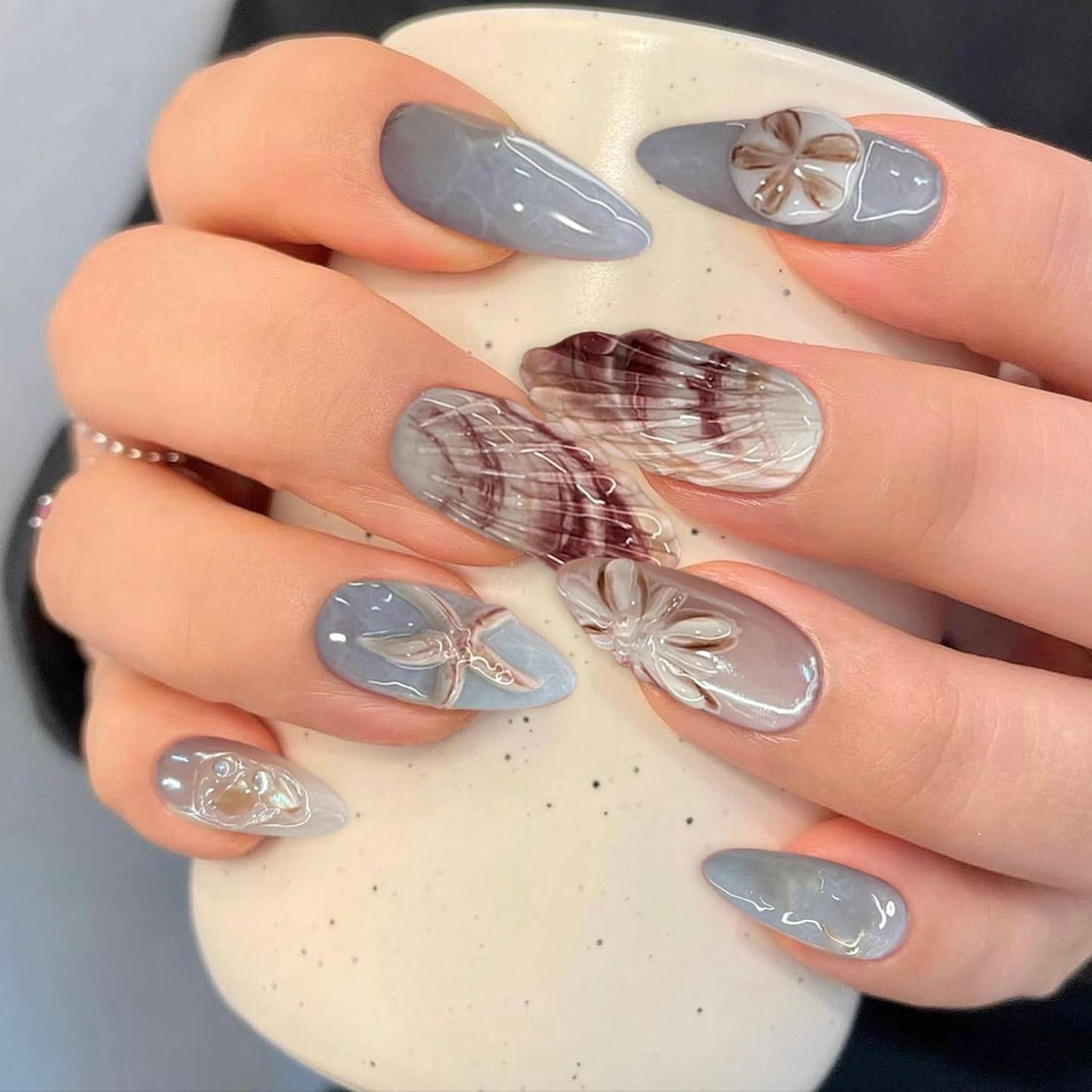 CharmBurst 24pcs Almond Shape Nails, Summer Ocean Style, 3D Stripes Adhesive Nails, Shell Pattern False Nails, Starfish False Nails