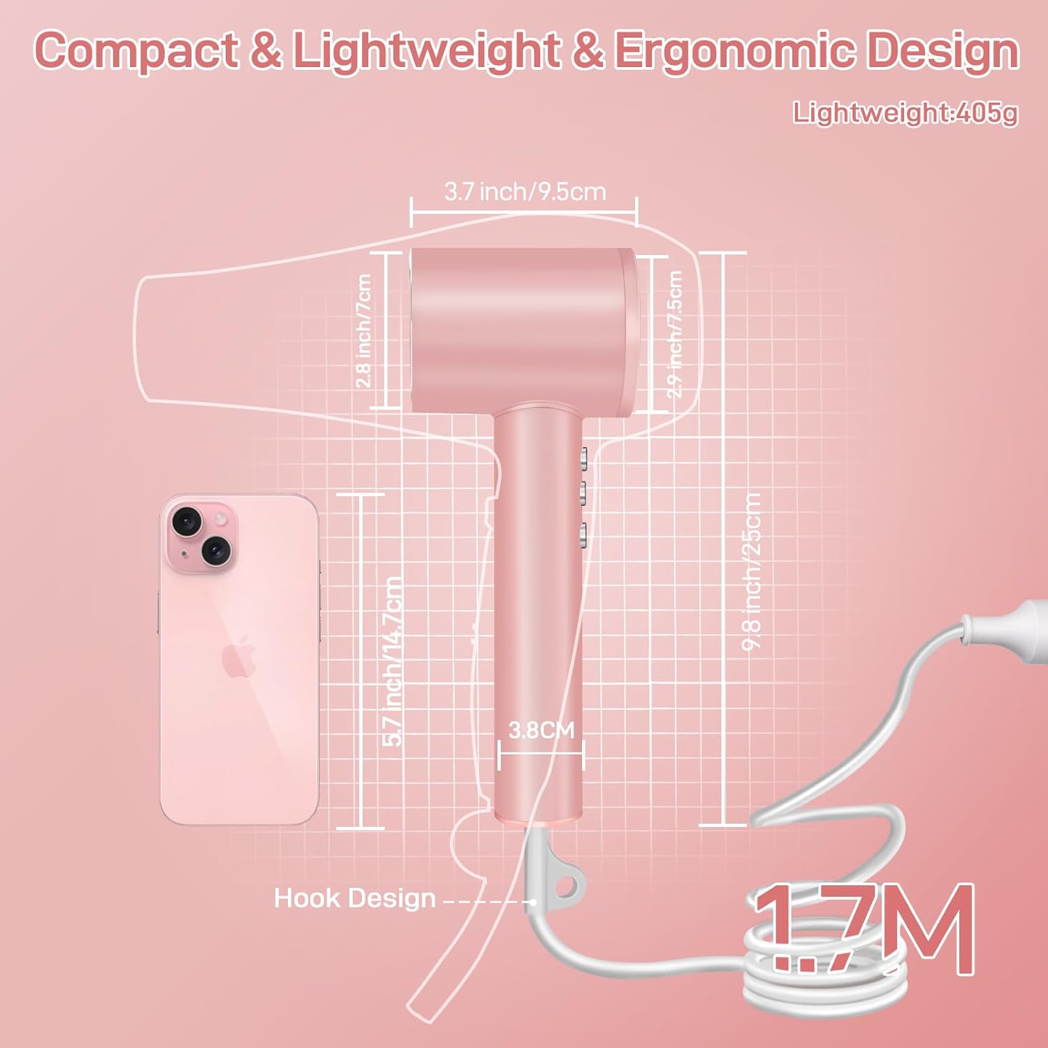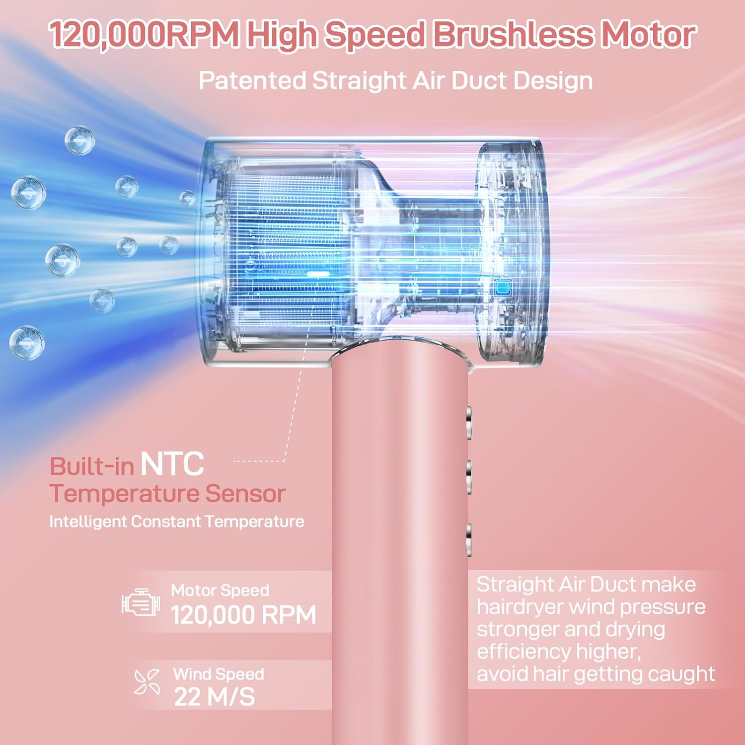 CIICII Ionic Haardroger Professioneel, 120000RPM High Speed föhn (1600W Borstelloos / 3-Snelheden / 5-Temp & HD-Display & Draagbare Reistas) Sneldrogende Haardroger voor Thuis Kapsalon (Roze)