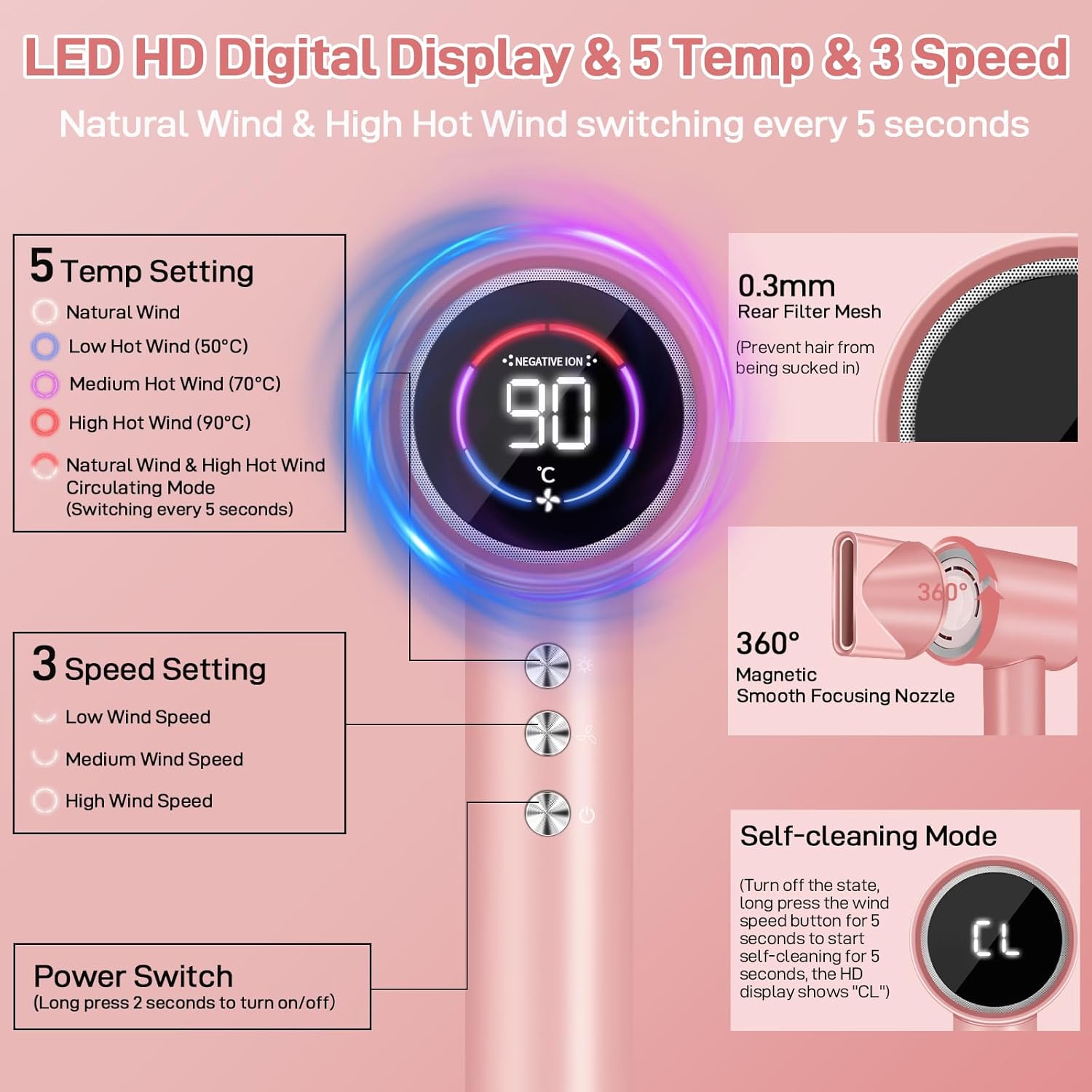 💡HD Digitale Weergave & 5 Temperatuur- en 3 Snelheidsinstellingen: ❶LED HD Display toont duidelijk de windsnelheid en -temperatuur, zelfreiniging en andere werkstatussen van de haardroger, waardoor het drogen van het haar makkelijker en nauwkeuriger wordt. ❷5 temperatuurmodi – Natuurlijke wind, Zwakke hete wind (50°C), Medium hete wind (70°C), Hoge hete wind (90°C), Natuurlijke wind & Hoge hete wind circulatiemodus (Omschakelen elke 5 seconden). ❸3 modi voor windsnelheid – lage, gemiddelde en hoge windsnelheid. ☛15 windcombinaties voor verschillende droogbehoeften.