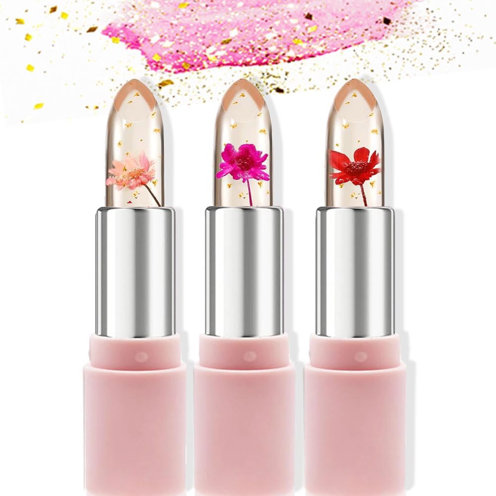 Clear Flower Jelly Lipstick, 3 Packs of Nutritious Moisturizer, Lip Balm, Temperature Change, Matt, Durable Lip Gloss (Pink-3)