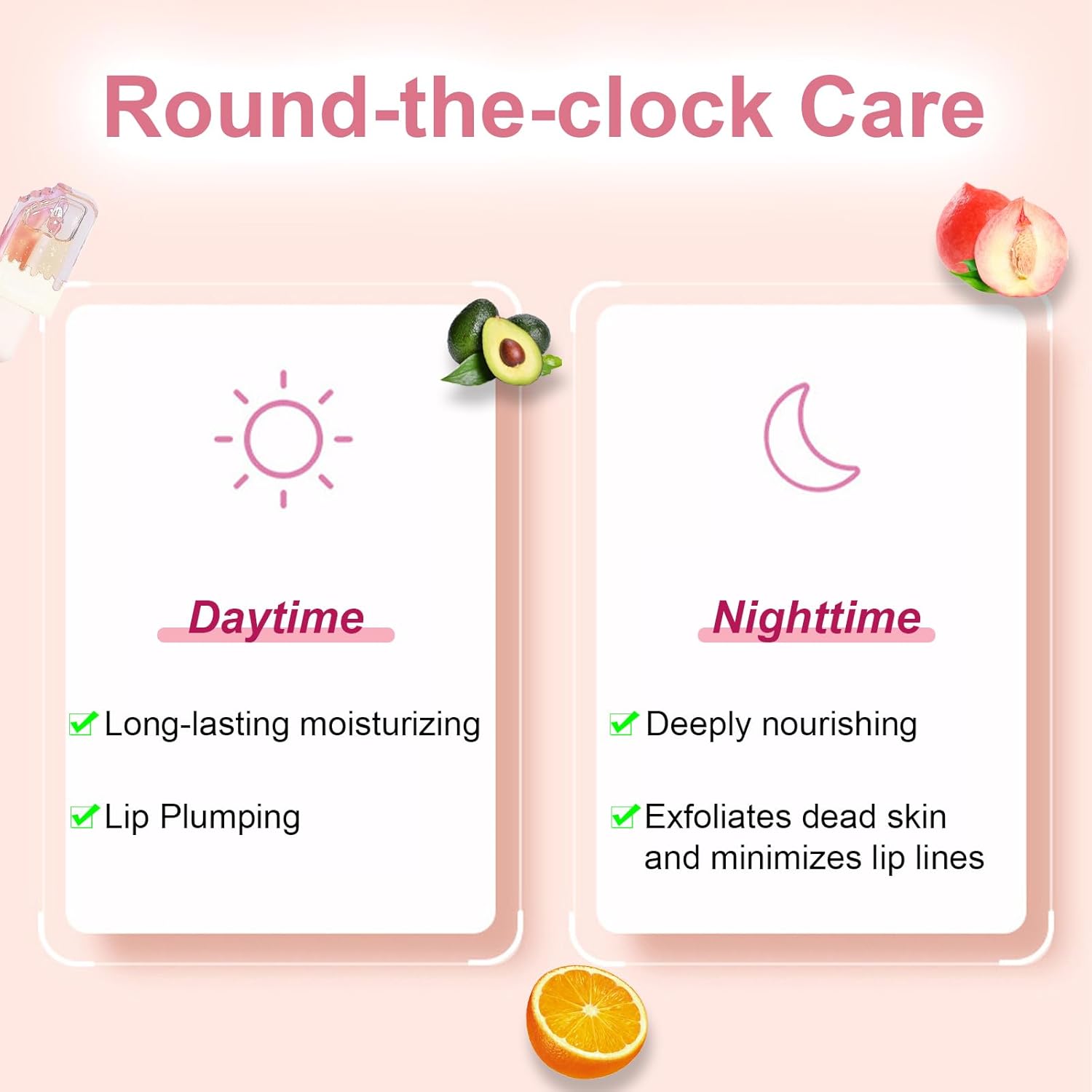 Onderhoud gedurende de hele dag: 3 lipgloss in de smaken avocado, oranje en perzik voor gebruik de hele dag door. Overdag aanbrengen om de lippen te hydrateren en ‘s avonds dik aan te brengen om ze zacht te repareren en dode huidcellen te verwijderen.