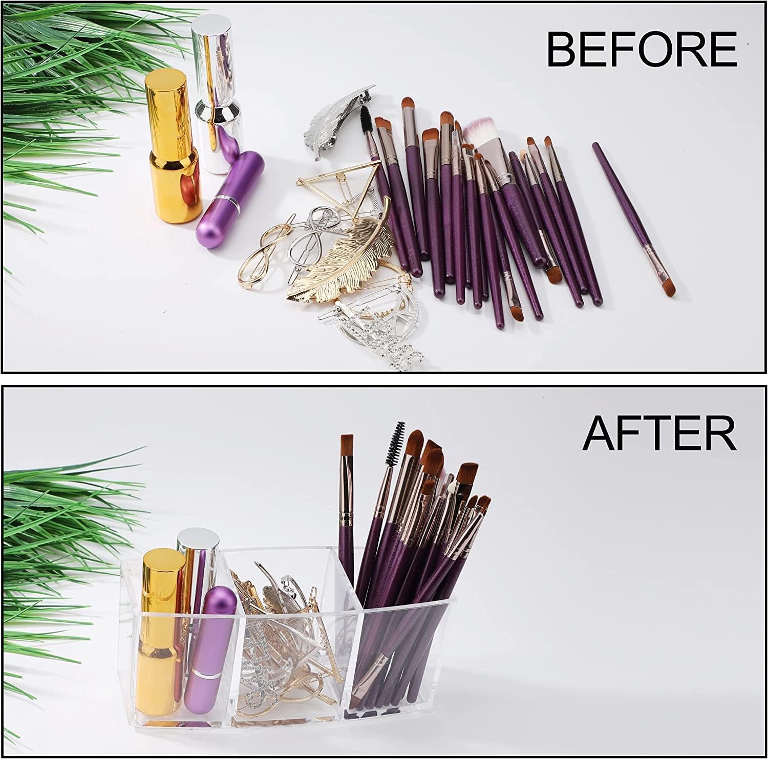 Makeup brush holder: 3 slots for organising your eyelash brushes, blushers, lipsticks, eyeliner pencils, contour brushes, compacts etc. It is a space-saving accessory that keeps your cosmetics neat and organized.