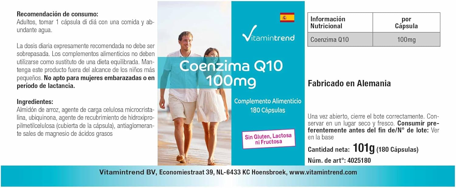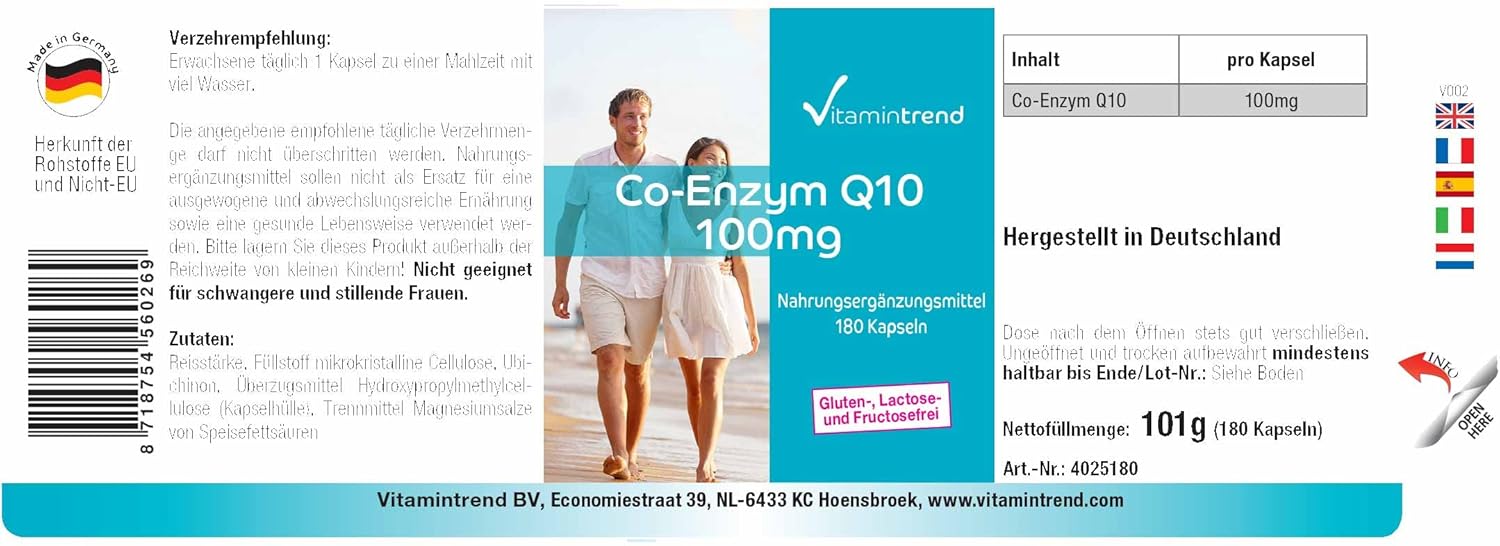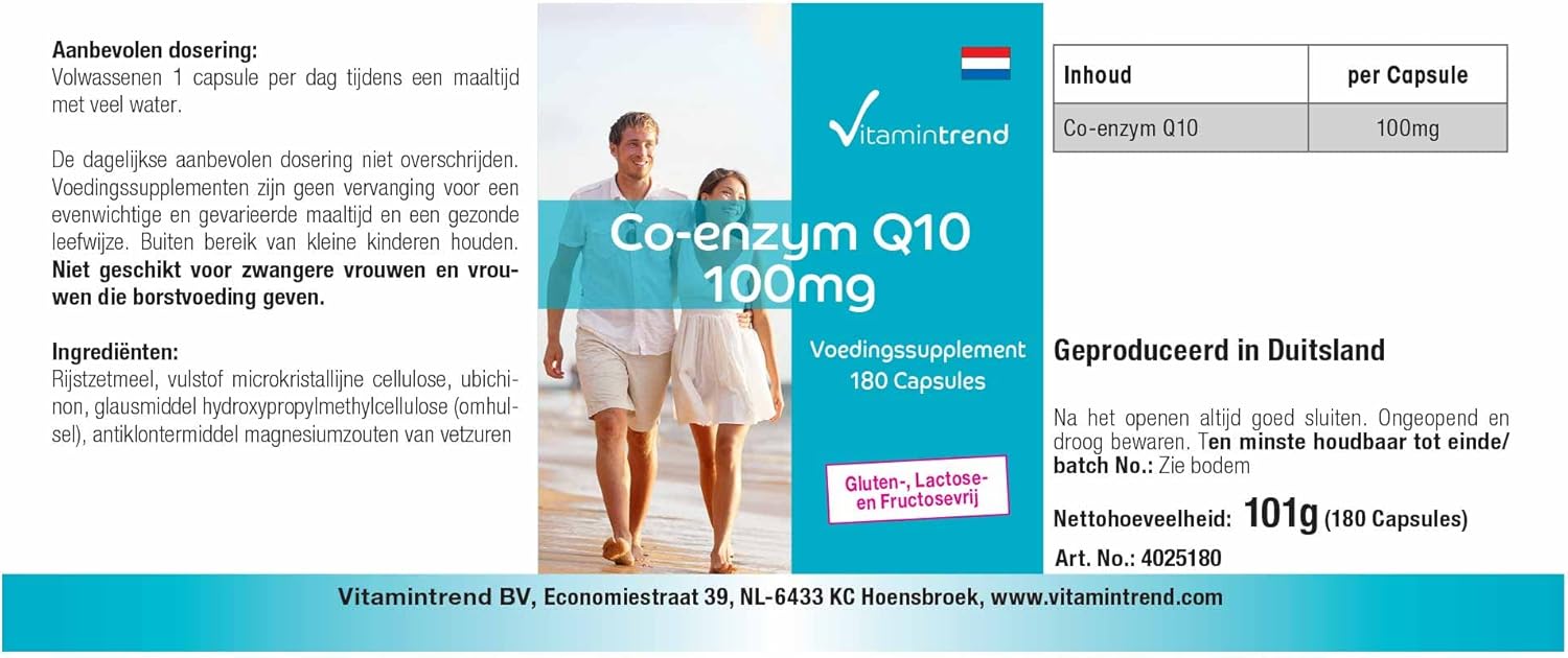 ✅ VITAMINTREND Duitse kwaliteit. Een capsule bevat: 100mg co-enzym Q10 – aanbevolen dagelijkse dosis: 1 capsule bij een maaltijd met veel water – hoog gedoseerd actief ingrediënt – uitstekende prijs-kwaliteitverhouding. Essentieel voor de eigen energieproductie van het lichaam.