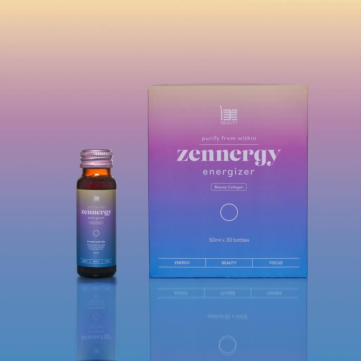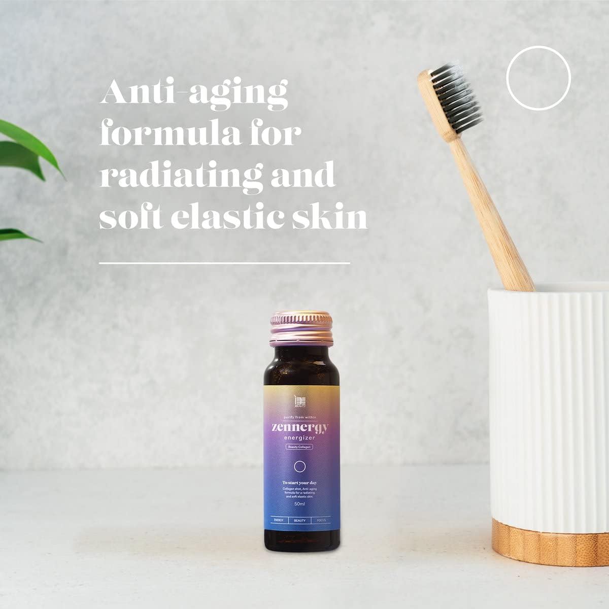 Een collageen beauty shot per dag ondersteunt de conditie van je huid en stimuleert de natuurlijke collageenproductie. Zennergy Energizer is een anti-aging formule die je energieniveau gedurende de dag ondersteunt, je focus bevordert en helpt de zichtbare tekenen van veroudering te verminderen. Voor een stralende, zachte en elastische huid.