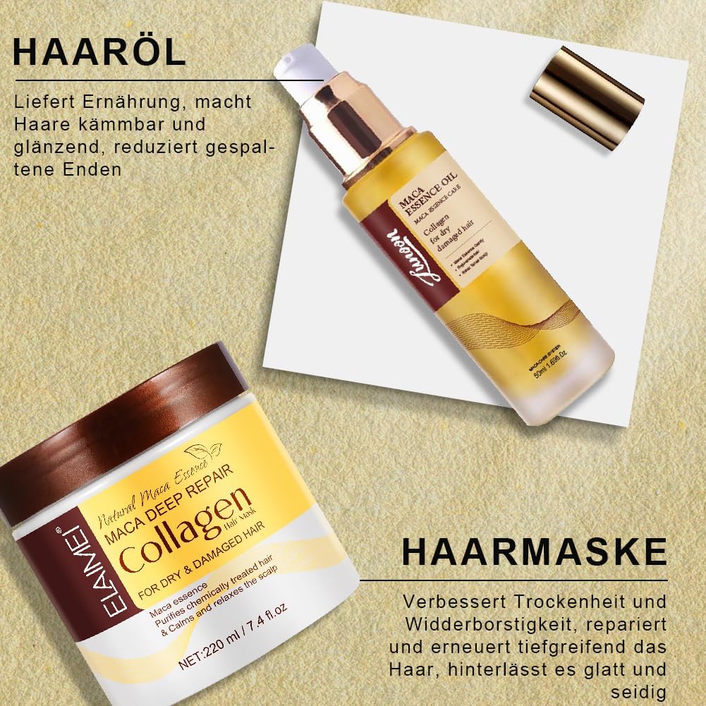 Collageen haarmasker en haarolieset, maca haarverzorging, arganolie, dieptereparatie, collageen, haarmasker voor droog beschadigd haar, herstel van soepelheid en glans, alle haartypes