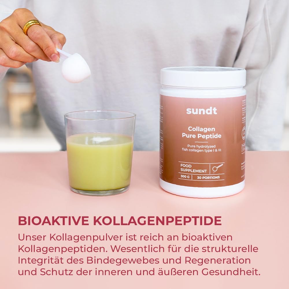 Im Zuge eines Produkttestes durfte ich dieses Produkt auf Herz und Nieren testen.Gerne teile ich meine Meinung mit euch.Geliefert wird hier eine Dose mit 300g Kollagenpulver der Marke sundt.Wie immer wurde schnell und sicher geliefert.Die Dose ist angenehm unauffällig gestaltet und alle relevanten Infos sind gut leserlich zu erkennen.Kollagen ist sehr proteinhaltig und kann vom Körper optimal verwertet werden.Es gibt verschiedene Typen von Kollagen, die in unterschiedlichen Tieren vorkommen und natürlich auch unterschiedlich verwertet werden können. Hier werden die Typen 1 und 3 verwendet, was für eine tolle Verwertbarkeit steht, es geht aber auch besser, da es noch weitere Typen gibt.Kollagen kommt im menschlichen Körper vor und sorgt unter Anderem für eine geschmeidige Haut. In der Beauty-Segment wird es häufig in Cremes verwendet, da es die Haut aufpolstert und Falten mindert bzw. die Bildung von Falten verlangsamt.Kollagen kann man nicht nur cremen, sondern auch über die Nahrung einnehmen. Hier wirkt das Kollagen dann natürlich nicht punktuell, sondern ganzheitlich im Körper.Ich spiele Volleyball und habe sehr oft Probleme mit Gelenken.Auch hier wirkt Kollagen und ich muss sagen, dass ich deutlich weniger anfällig für Verletzungen bin.Natürlich ist man damit nicht völlig befreit von Verletzungen, aber man ist deutlich besser vorbereitet. Kollagen muss regelmäßig und über einen längeren Zeitraum eingenommen werden, um einen spürbaren Effekt zu erzielen.Das Pulver löst sich im Wasser sehr gut auf.Ich mische Kollagen sonst immer mit Shakes oder Müsli, dieses Pulver ist geschmacksneutral, wobei neutral ein leicht muffiger Geschmack ist, daher mische ich es meist in Saft, oder in Joghurt.Ganz wichtig bei allen Supplements ist natürlich, dass sie keine Wunder bewirken. Solche Supplements müssen über einen längeren Zeitraum kontinuierlich eingenommen werden und natürlich muss man dann auch dementsprechend Leistung bringen, damit die Erfolge sichtbar sind.Supplements können sehr gut unterstützen, ersetzen aber weder Sport, noch eine gesunde Ernährung.Ich finde das Kollagenpulver sehr gelungen und bin sehr zufrieden. Ich kann es absolut weiterempfehlen.Es ist jedoch recht teuer, hier gibt es günstigere Alternativen, oder Alternativen, die auch noch andere Typen an Kollagen mit integrieren, oder andere Wirkstoffe wie z.B. Hyaluronsäure und/oder Vitamin C mit integrieren.Geschmack: 3/5Preis: 2/5Inhaltsstoffe: 4/5Löslichkeit: 4/5