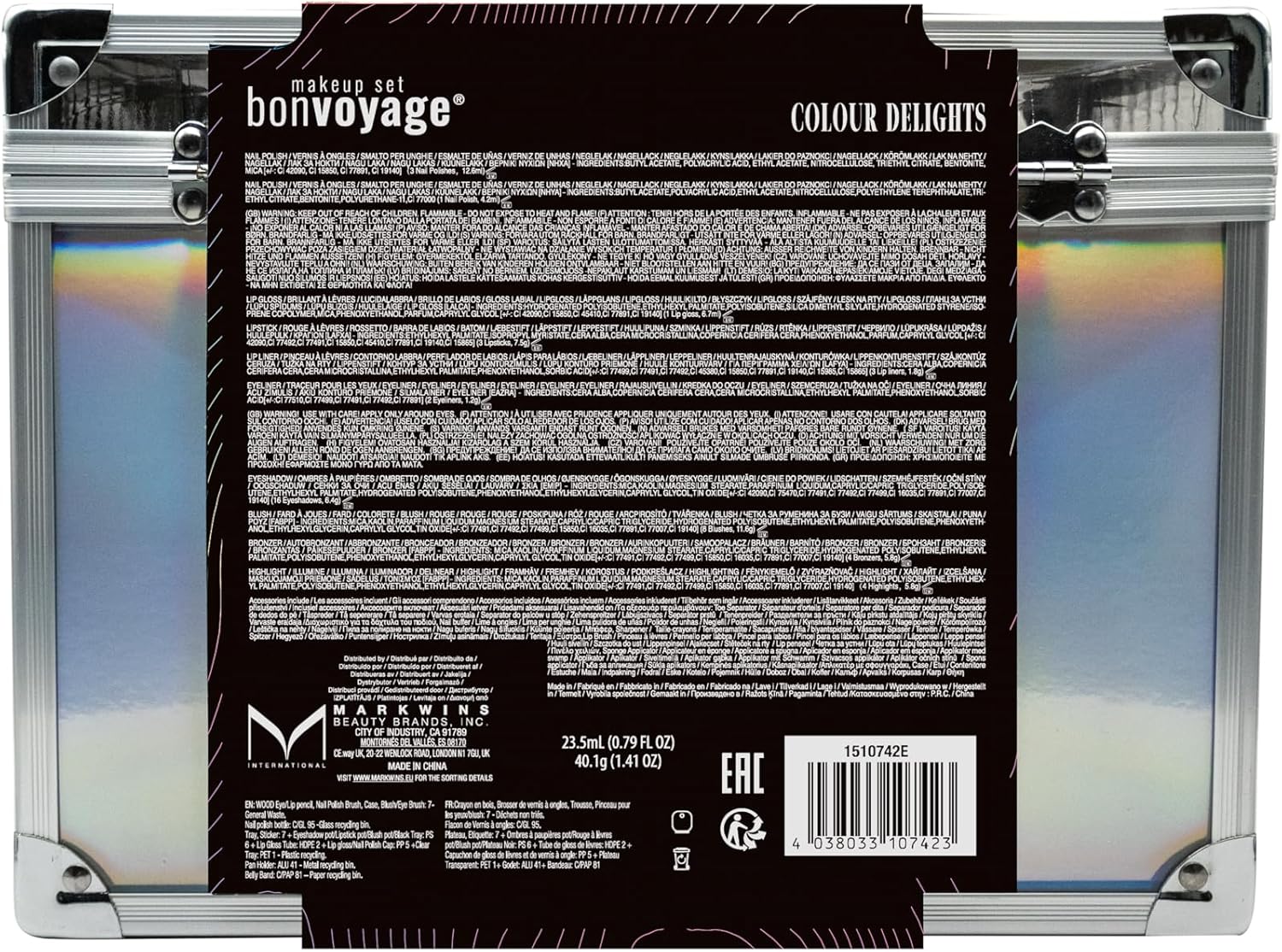 Probeer de Colour Delights Make-up Briefcase. Een transparant koffertje dat alles bevat wat je nodig hebt voor je make-up. Laat je creativiteit de vrije loop met deze set make-up producten. Het koffertje bevat 3 lipsticks, 3 lipliners, 20 oogschaduws, 1 eyeliner, 4 blushes, 4 bronzers, 3 strobes, 3 nagellakken, 2 teenscheider, 1 nagelbuffer, 1 puntenslijper, 2 lippenkwasten, 1 blushkwast, 2 dubbele sponsapplicators, 2 nagelriemstokjes. Het cadeau-idee voor alle vrienden en familieleden die beautyliefhebbers zijn. Een complete set professionele cosmetica om overal mee naartoe te nemen en altijd onberispelijk voor de dag te komen.