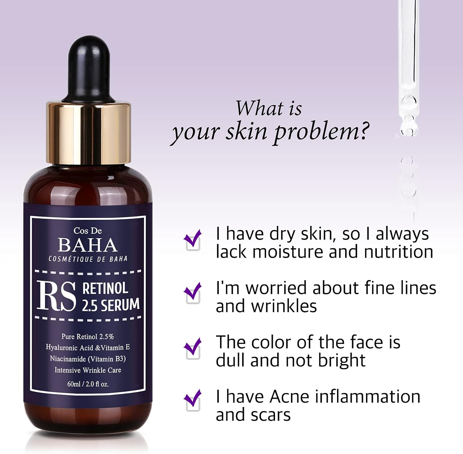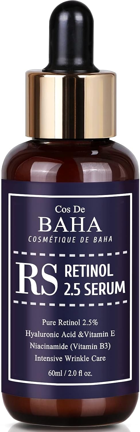 Overzicht van het product: Cos de BAHA Retinol 2.5% Facial Serum 60ml with Vitamin E – Facial Crepe Erase + Diminishes Acne-prone + Age Spot Remover + Retinol Serum 2.5 High Strength for Face without a Prescription Gezichtsverzorging