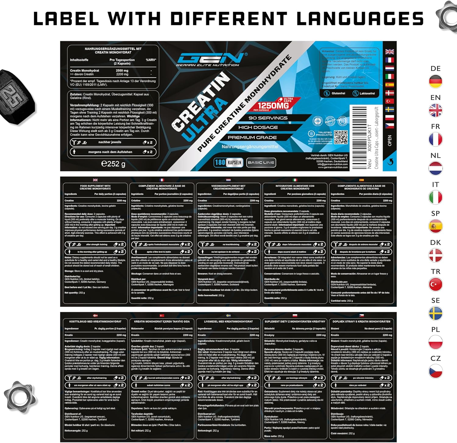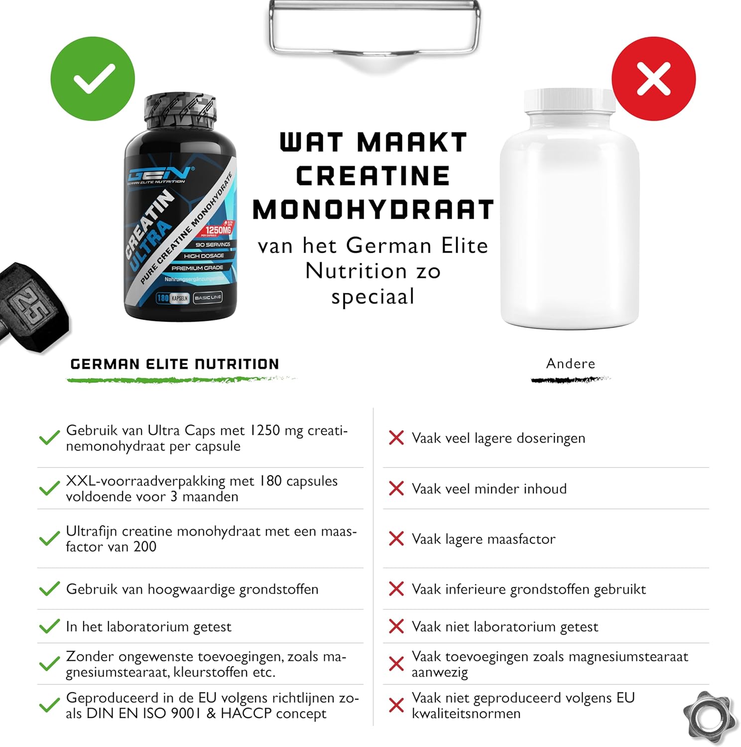 Creatine Ultra Caps – 180 capsules met elk 1250 mg puur creatine-monohydraat – Premium: Ultrazacht + Maasfactor van 200 – Hooggedoseerd