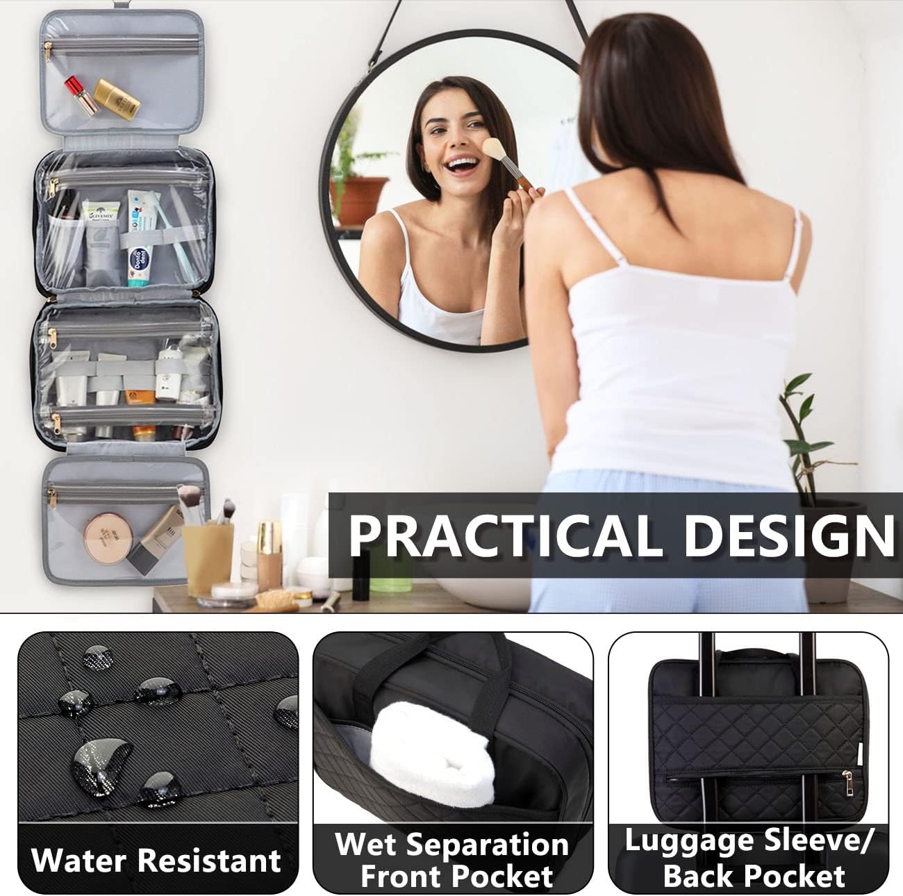 Dames Toilettas, VASCHY Toilettas Groot Reistoilettas Mode Hangende Toilettas Waterbestendige Make-Uptas met Bagageriem en Meerdere Vakken voor Vakantie, Zakenreis, Sportschool, Kamperen (Zwart)