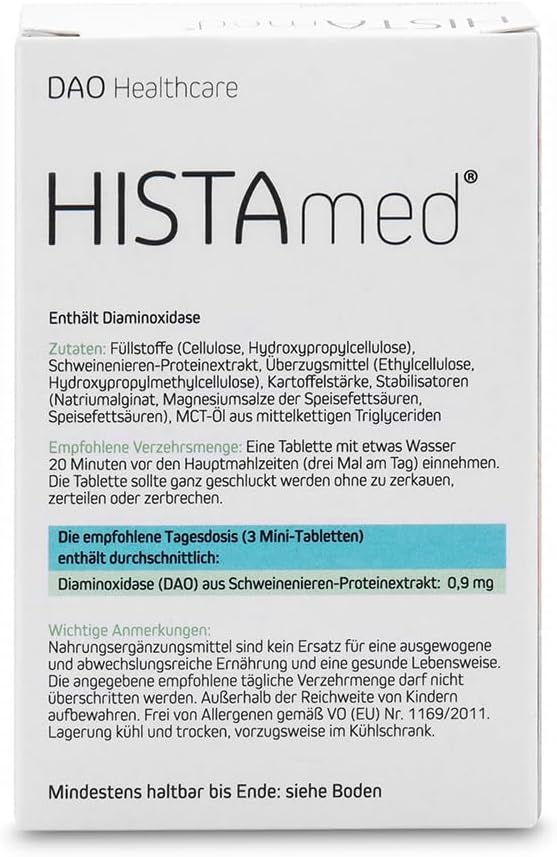 Die sehr kleinen Diaminoxidase-Tabletten befinden sich in einer praktischen Dosierbox, die kleiner ist als eine Zigarettenschachtel. – Ich habe sie immer in meiner Handtasche. (ohne Kühlung)Was den Effekt angeht: Hervorragend, selbst wenn ich die Tablette mal weniger als 20 Minuten vor der Mahlzeit einnehme. Es kann vorkommen, dass dennoch Probleme auftreten, aber dann muss ich oft retrospektiv einräumen, dass noch Ko-Faktoren zu berücksichtigen sind, beispielsweise ein Tag mit insgesamt hohem Anteil an histaminreichen Nahrungsmitteln / Getränken.Letzter Selbsttest vor wenigen Tagen: 1 Scheibe Butterkäse ohne Histamed. – Knapp eine Stunde später Beschwerden.Zwei Tage später: Histamed 20 Minuten vor dem Verzehr desselben Butterkäses plus einer Tasse Kakao. – Null Beschwerden.Zu beachten ist, dass die Maximaldosis 3 Tabletten pro Tag beträgt. – Ich selber nehme maximal 2 pro Tag. – Allerdings habe ich inzwischen auch weitere Veränderungen in der Ernährung / Speisenauawahl umgesetzt, weshalb ich Histamed gar nicht mehr täglich benötige.Wissenswert hierzu: Diaminoxidasetabletten sollen wohl “den Darm ärgern”. – Vor dem Hintergrund, dass dort bei den meisten Personen mit Histaminunverträglichkeit ohnehin das ursächliche Problem lokalisiert ist, sollte die Einnahme immer mit Verstand erfolgen. – Histamed macht es für mich möglich, beschwerdefrei und / oder beschwerdereduziert zu essen und gelegentlich auch “zu sündigen”. Es mildert Symptome, löst aber nicht das ursächliche Problem.Preis: Mit etwa 50 Cent pro Tablette ist Histamed deutlich günstiger als vergleichbare Präparate aus der Apotheke, die meiner Erfahrung nach den identischen Effekt haben. Bei der durch die Histaminunverträglichkeit ohnehin erhöhten Belastung der Haushaltskasse ein ganz deutlicher Pluspunkt zu Gunsten von Histamed. 👍Empfehlung meinerseits. 👍