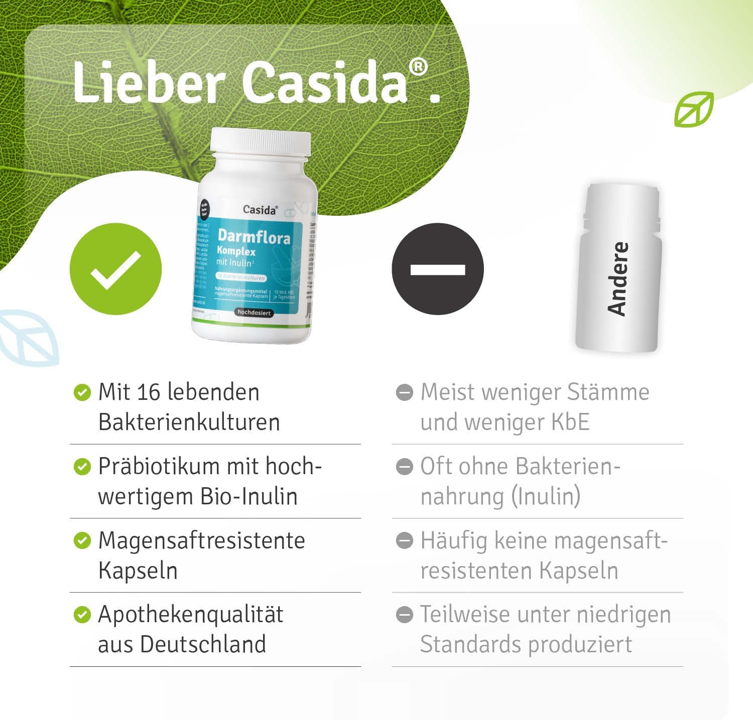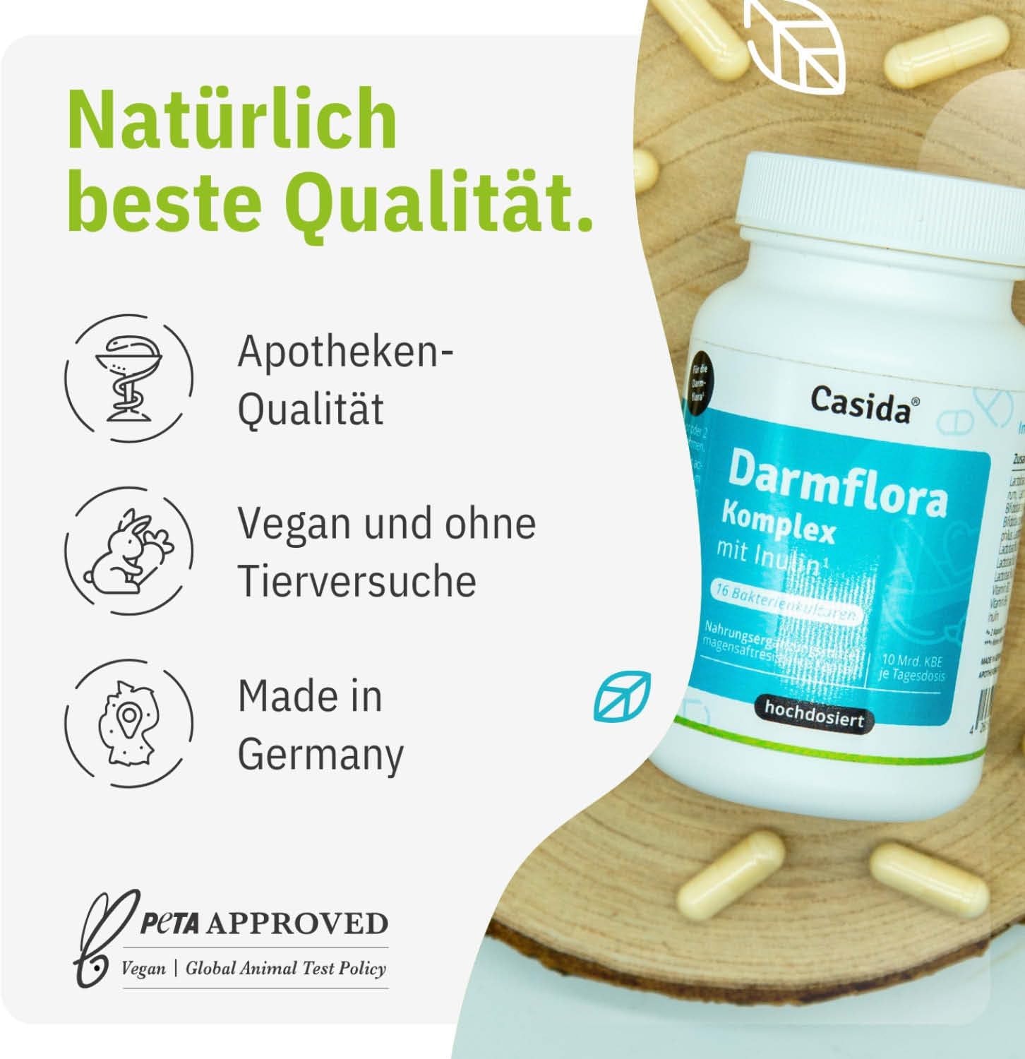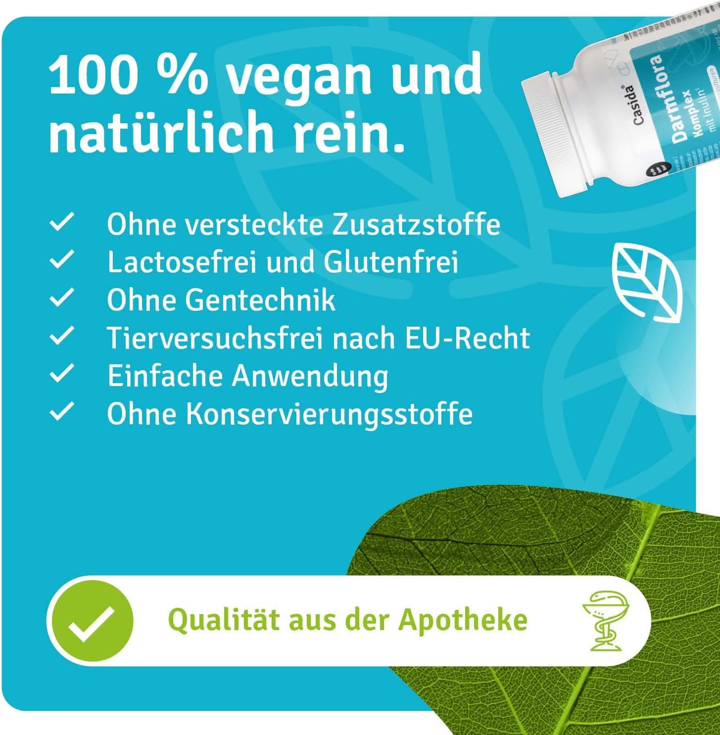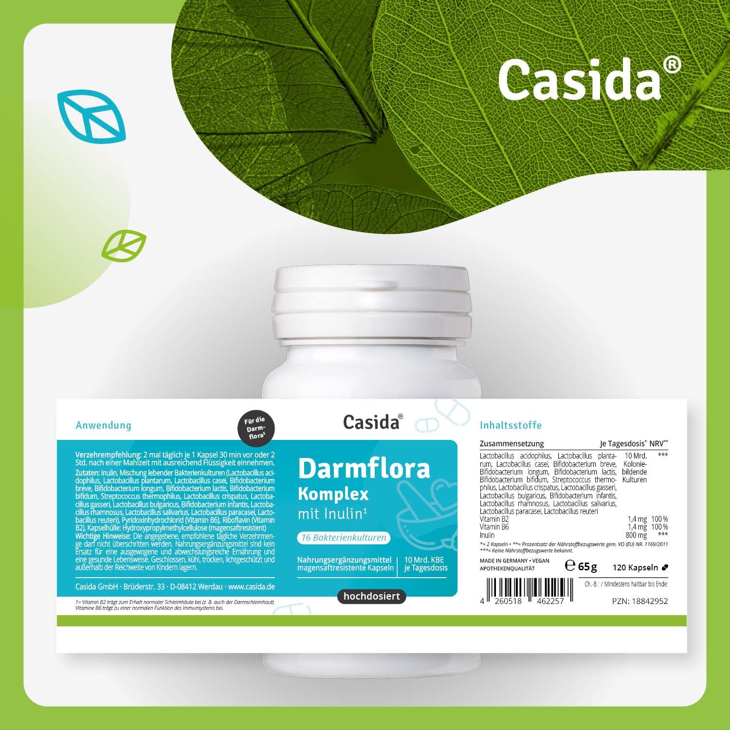 Darmflora-complex met inuline ter ondersteuning van een evenwichtige darmflora. Een goed functionerende darm is cruciaal voor het algemene welzijn en de ondersteuning van fysieke en mentale prestaties. Het natuurlijke evenwicht van micro-organismen in de darm kan echter uit balans komen door factoren zoals ziekten, medicijnen, onevenwichtige voeding of stress. De gerichte opname van geselecteerde bacterieculturen in combinatie met bijpassende voedingsstoffen kan het natuurlijke evenwicht bevorderen, de spijsvertering en de opname van voedingsstoffen ondersteunen. Het darmflora-complex met inuline ondersteunt de vestiging van nuttige bacteriën in de darm. De 16 zorgvuldig samengestelde bacteriestammen uit de groep lacto- en bifidobacteriën worden aangevuld met inuline, die deze culturen als voedingsstof dient en zo de vestiging en activiteit kan bevorderen. Aanbevolen consumptie: 2 keer per dag 1 capsule Tip: 30 tot 60 minuten voor een maaltijd of twee uur na een maaltijd met voldoende vloeistof innemen Opmerking: de aangegeven dagelijkse hoeveelheid mag niet worden overschreden. Buiten het bereik van kleine kinderen bewaren. Goed gesloten, droog en koel bewaren. Voedingssupplementen zijn geen vervanging voor een evenwichtige en gevarieerde voeding en een gezonde levensstijl.