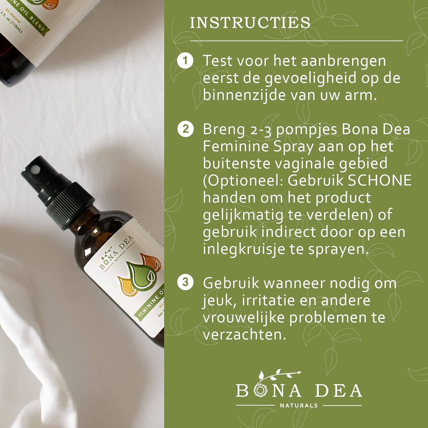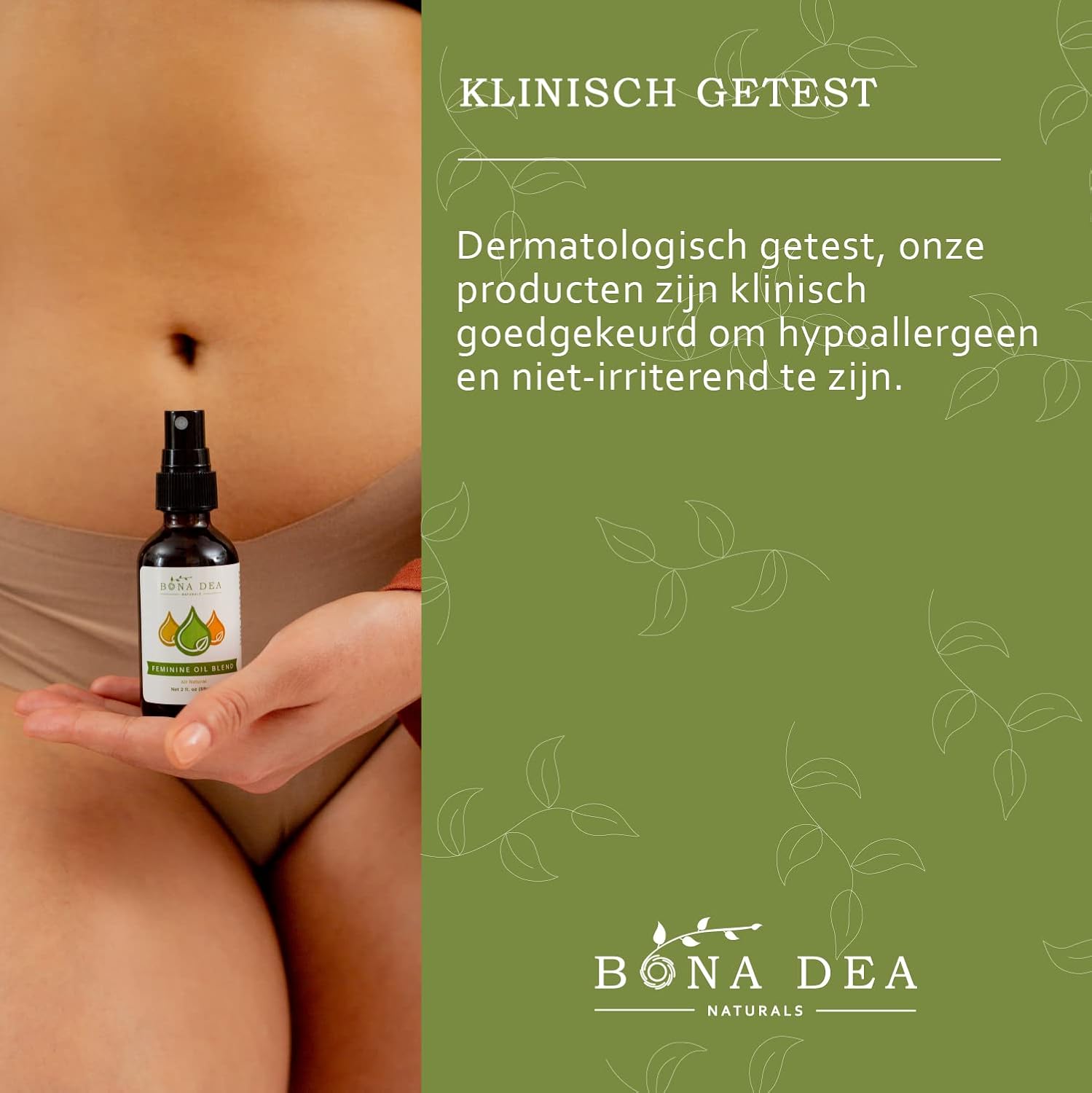“Bona Dea Naturals Feminine Mengolie biedt directe verlichting bij veel voorkomende vaginale problemen, zoals branderigheid, jeuk, afscheiding, pijn en geur. Of u nu regelmatig last hebt van deze irritaties of als je op dit moment aan de symptomen van een acute infectie lijdt, het toepassen van dit volledig natuurlijke mengsel van oliën kan de meeste vaginale ongemakken verlichten. Bona Dea Naturals Feminine Deodorant is met natuurlijke bestanddelen, zoals Calendula en Echinacea, geformuleerd om u een effectieve en natuurlijke oplossing te bieden voor een aantal van de meest voorkomende problemen van vrouwen! Onze producten zijn dermatologisch getest en klinisch goedgekeurd als hypoallergeen en niet-irriterend. Behandel dringende problemen direct of gebruik dagelijks om een evenwichtige balans te behouden. Ook geweldig als aftershave spray! Wacht niet langer als verlichting VANDAAG mogelijk is!”
