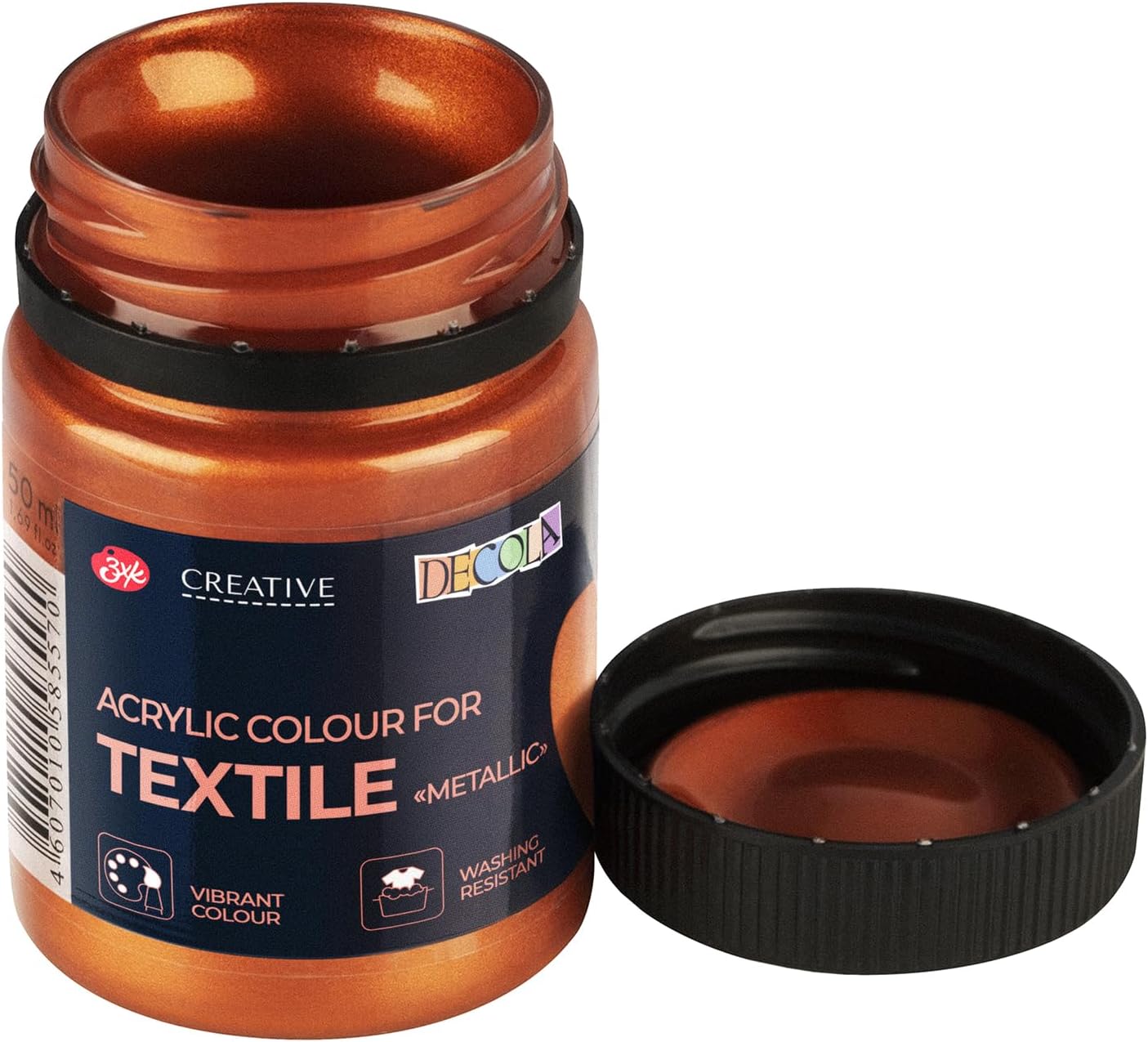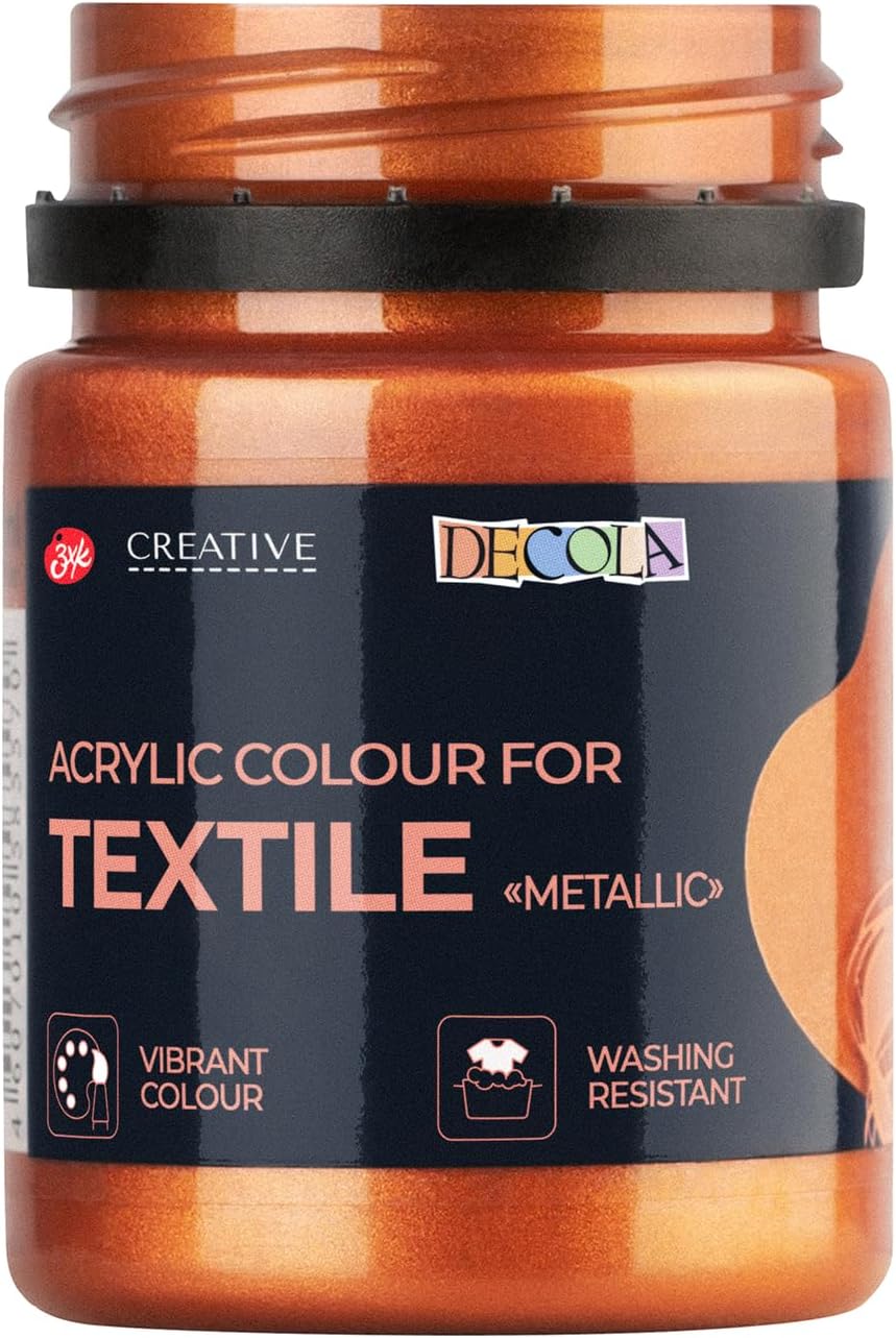 🎨 HOGE PIGMENT-INTENSITEIT — Gebruik voor het beste resultaat metallic Decola-textielkleuren — Ondoorzichtige kleuren met een hoge dekking op donker textiel — 50 ml van een krachtige koperen kleur — Meng de kleuren met elkaar of met water om een andere intensiteit of tinten te creëren