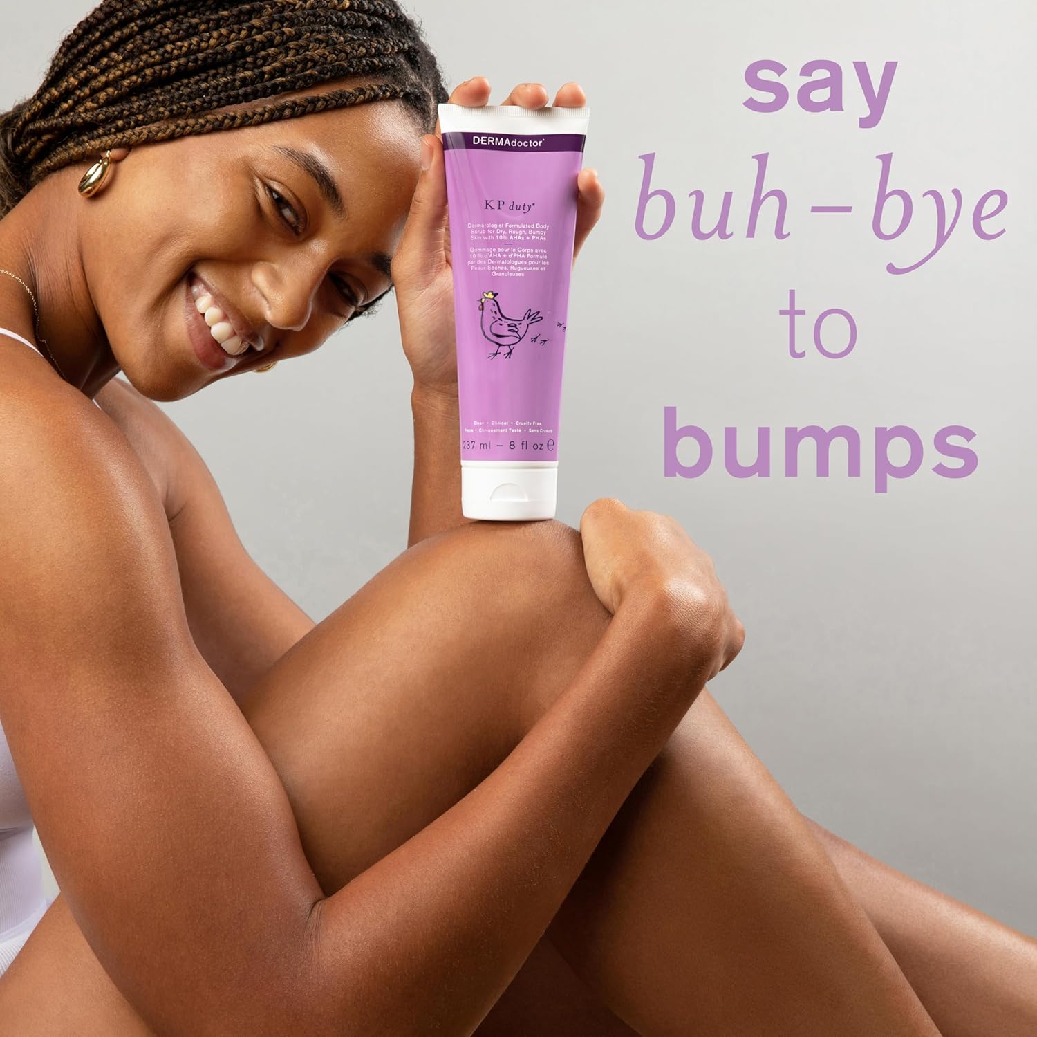 DERMAdoctor oplossing: de volgende generatie van onze cultklassieker, de KP Duty Body Scrub, is er. Deze ultramoderne formule combineert beproefde dermatologische middelen met de nieuwste bevindingen van de huidverzorging om het uiterlijk van droge, ruwe, broze huid en keratosis pilaris (kippenhuid) drastisch te verbeteren. Verwen jezelf met deze peeling met dubbel effect. Dermadoctor’s KP Duty Body Scrub Peeling voor keratosis Pilaris en droge, ruwe, hobbelige huid met 10% AHA’s + PHA’s combineert de voordelen van een chemische peeling en microdermabrasie in één eenvoudig te gebruiken formule. Deze schone, klinische en dierproefvrije formule zit boordevol klinisch werkzame AHA’s, PHA’s, BHA en rustgevende plantaardige stoffen – teunisbloem-, bessen- en bernagieolie. Samen dragen deze ingrediënten bij aan het behoud van een ongelooflijk zachte en gezonde huid.
