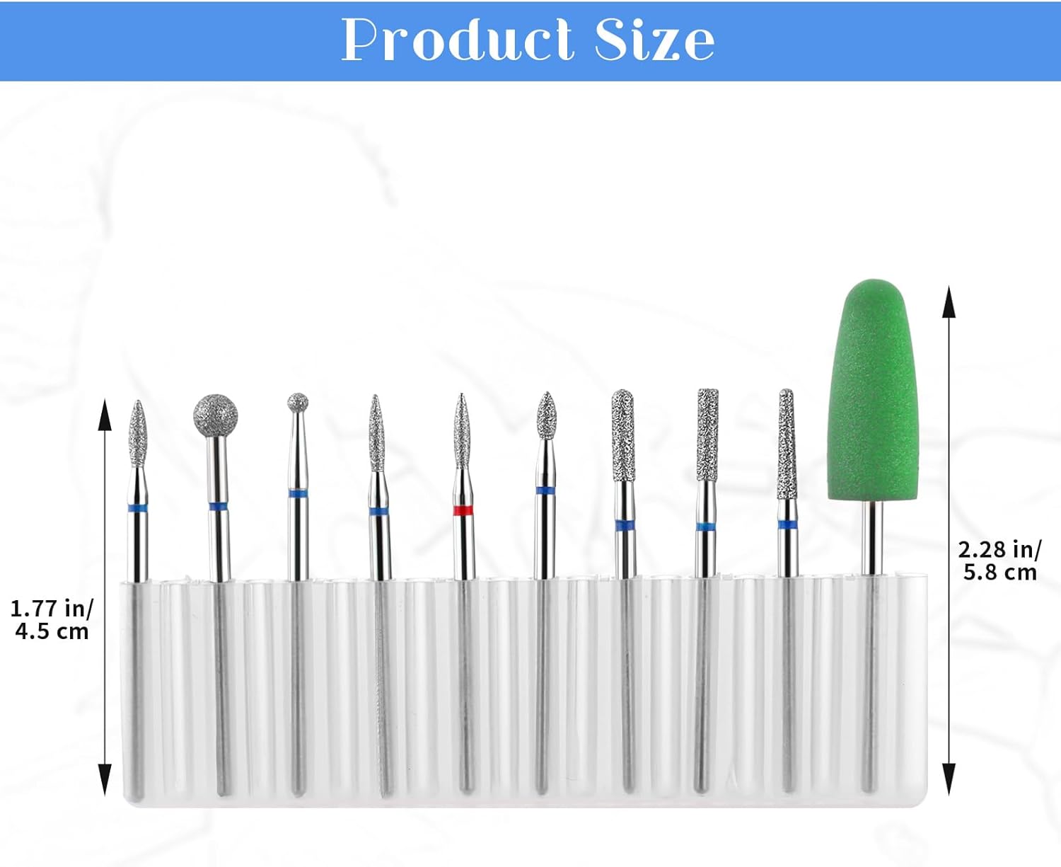 This is a very nice set of nail drill bits. Also comes with a flip top plastic storage box, too.I’m especially impressed with the round bits. This set pretty much covers every usage scenario you’d need to cover. I’d recommend it as it’s a great value for the money.The bit stems are color coded as well with blue and red. Blue = polish removal, acrylic, natural nails. Red = cuticle, skin safe. Both are beginner color codes according to the standard color code system used for nail drills.
