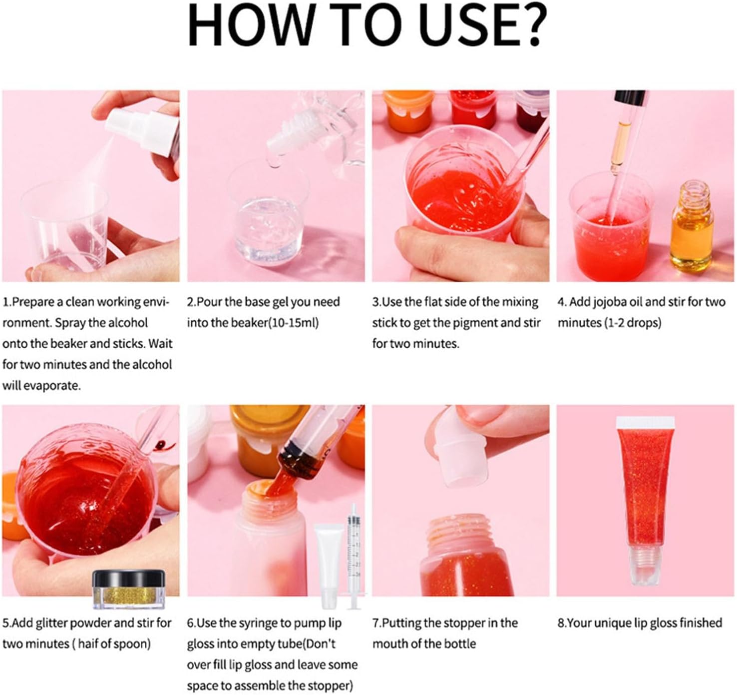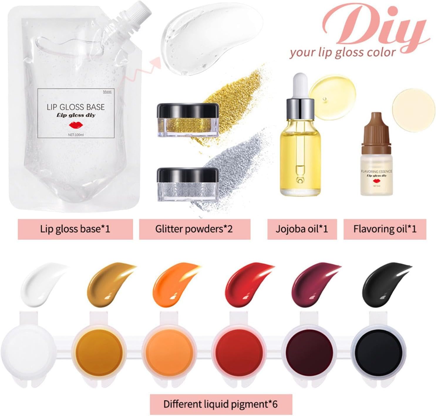 Inbegrepen componenten: de kit bevat 10 lege lipglossbuizen, 1 lipgloss basis, 2 glitterpoeders, 6 vloeibare verven, 1 jojoba-olie, 5 rietjes, 1 beker, 2 roerstokjes, 2 poederlepels, 1 kruidenolie en 1 instructieboekje.