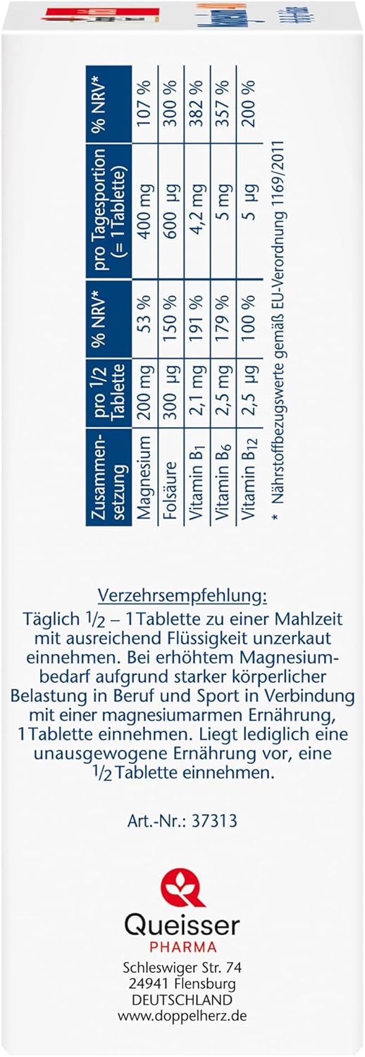 Wenn es um Nahrungsergänzungsmittel geht, ist die Wahl eines Produkts, das die täglichen Bedürfnisse effektiv deckt, entscheidend. Das Doppelherz Magnesium 400 + B1 + B6 + B12 + Folsäure hat sich in meinem Alltag als zuverlässiger Begleiter erwiesen.Vorteile:Hochdosiertes Magnesium: Mit 400 mg Magnesium pro Tablette unterstützt dieses Präparat effektiv die normale Funktion von Muskeln und Nerven.Vitamin-Komplex: Die Vitamine B1, B6, B12 und Folsäure ergänzen das Magnesium hervorragend und tragen zur normalen Energiegewinnung und zum gesunden Stoffwechsel bei.Einfache Einnahme: Die Tabletten sind leicht zu schlucken und verursachen keine Magenbeschwerden.Persönliche Erfahrungen:Seit ich dieses Präparat benutze, fühle ich mich energiegeladener und weniger anfällig für Muskelkrämpfe nach dem Training. Besonders schätze ich die Kombination der Vitamine, die nicht nur zur körperlichen, sondern auch zur mentalen Leistungsfähigkeit beitragen.Fazit:Das Doppelherz Magnesium 400 + B1 + B6 + B12 + Folsäure ist eine wertvolle Ergänzung für jeden, der seine tägliche Nährstoffaufnahme unterstützen möchte. Mit seiner gut durchdachten Formel und den positiven Effekten auf Körper und Geist ist es ein Produkt, das ich ohne Vorbehalte empfehlen kann.Probieren Sie es aus und erleben Sie die positiven Veränderungen in Ihrem Alltag!