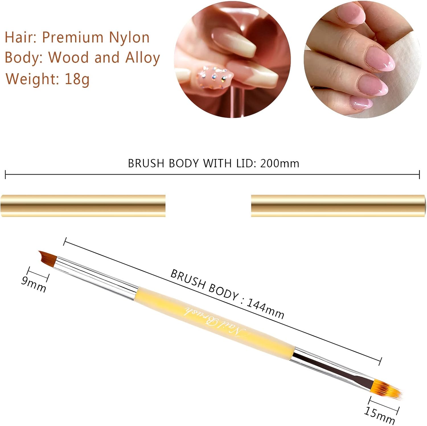 Kwasthaar: ombre-15mm, french tip-9mm. Hele kwast (met dubbele dop): 200mm.