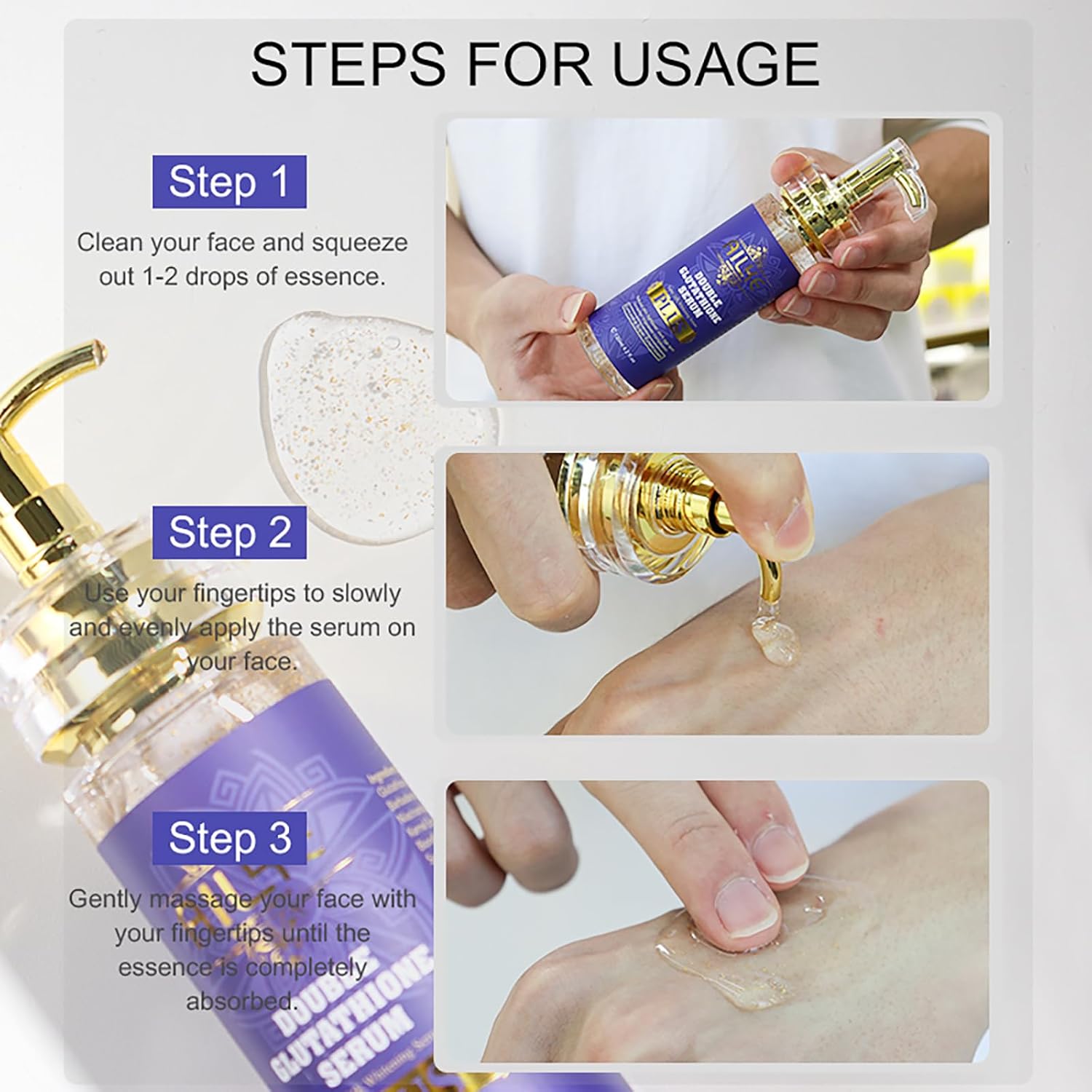This 4.2 fl oz Pump Bottle of Double Glutathione Serum arrived well-packaged and in good Condition. The Bottle is so Elegant looking. The Serum looks like it has Gold Glitter in it. It smells nice and has the Texture of a lightweight Gel. It’s easy to apply and absorbs well, leaving the Skin feeling moisturized. I like this Serum a lot because it has brightened up the Hyperpigmentation on my Cheekbones. I will be rebuying this Product.