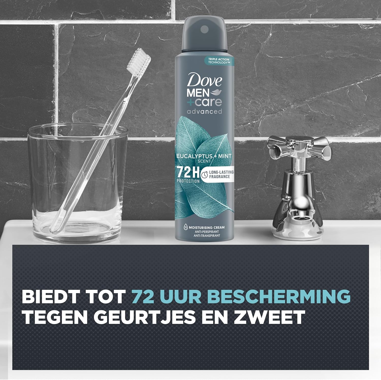 Over het product: Dove Men+Care Advanced Eucalyptus + Mint Anti-Transpirant Deodorant Spray met anti-bacteriële geurbestrijding beschermt tot 72 uur lang tegen zweet en nare geurtjes, heeft een langdurig frisse geur en verzorgt je oksels. Met een frisse, mannelijke geur voel jij je langdurig fris en zelfverzekerd. Deze Dove Men+Care anti-transpirant met 1/4 hydraterende crème verzorgt de okselhuid, zo behoren irritaties door zweet en scheren tot het verleden. Je krijgt een gehydrateerde en beschermde huid en gladde, comfortabel aanvoelende oksels. Dove Men+Care biedt naast anti-transpiranten ook deodoranten aan. Beide geven een langdurig fris gevoel en hebben een verzorgende werking voor de kwetsbare okselhuid. Anti-transpiranten bevatten aluminiumzouten die de hoeveelheid zweet verminderen en ervoor zorgen dat je oksels droog blijven, zodat onaangename geurtjes geen kans krijgen. Deodoranten bevatten geen aluminiumzouten, maar wel actieve ingrediënten die ongewenste geurtjes bestrijden. Beide formules zijn vrij van alcohol dus welke je ook kiest, je kunt altijd vertrouwen op bescherming, frisheid en heerlijk zachte en verzorgde oksels. Hoe te gebruiken: Klaar voor een langdurig fris gevoel? Schud de spuitbus eerst even voor gebruik en houd deze 15 cm van je oksels. Geniet vervolgens van de bescherming en verzorging die je verdient. Wacht een paar seconden na het aanbrengen van je anti-transpirant spray voordat je je favoriete shirt aantrekt, om vlekken te voorkomen. Dit geeft de anti-transpirant deodorant de tijd om te drogen en zorgt ervoor dat je volledig beschermd bent. Over Dove Men+Care: Dove Men+Care hanteert een andere definitie van kracht: een waarin verzorging centraal staat. Omdat Dove Men+Care gelooft dat verzorging een man sterker maakt. Echte kracht blijkt uit de manier waarop je zorgt voor mensen die belangrijk zijn, inclusief jezelf. Of je nu op zoek bent naar een deodorant die je de hele dag een fris en droog gevoel geeft of naar een douchegel om je huid te hydrateren. Dove Men+Care huidverzorgingsproducten zijn ontworpen om je huid te beschermen en te verzorgen.