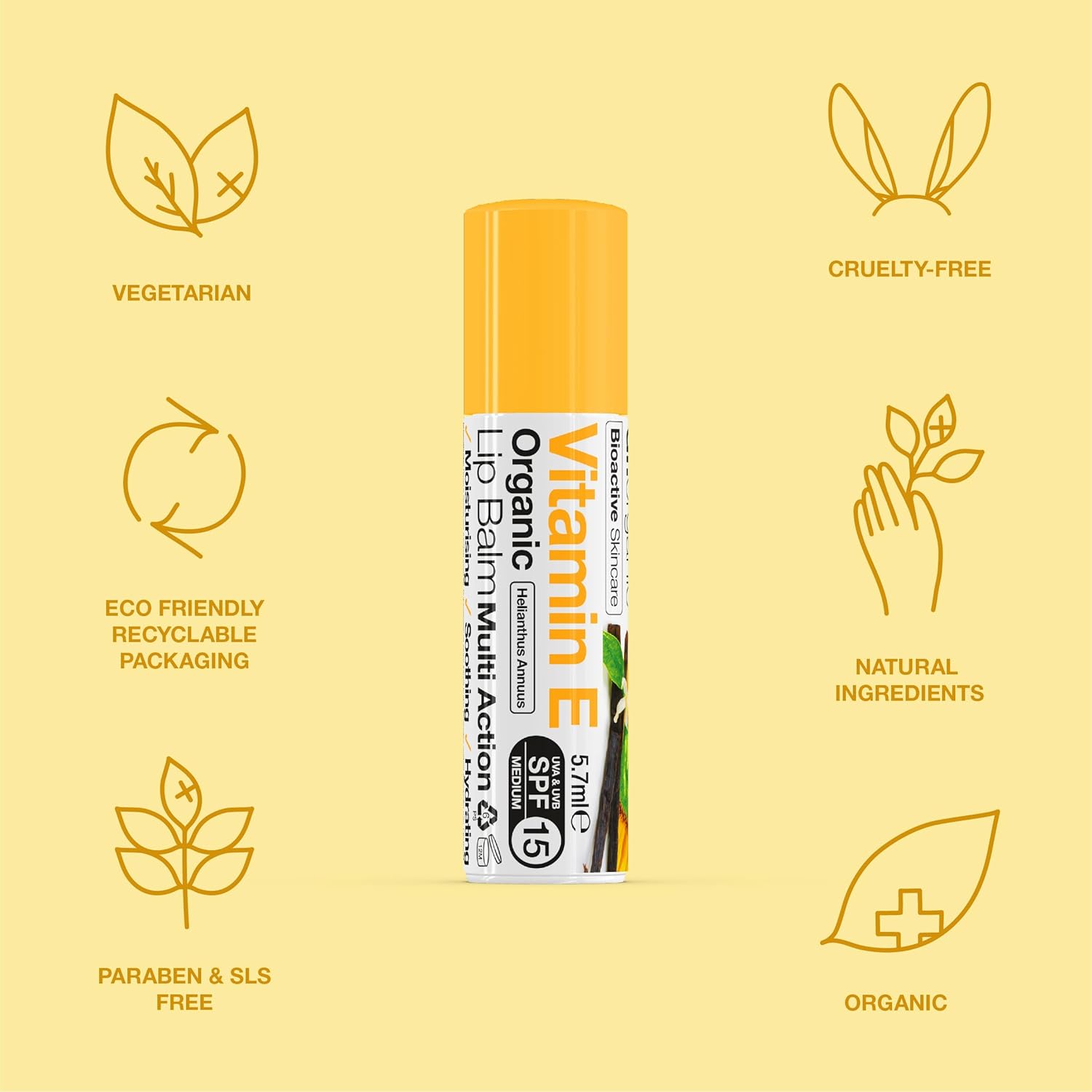 Verrijkt met vitamine E om de droogste huid te penetreren en te hydrateren, verzorgt de lippen onmiddellijk met behoud van elasticiteit. Biedt SPF 15-bescherming. Verrijkt met huidversterkende biologische vitamine E, een essentiële antioxidant die ook kan helpen om de huid gezond te houden.