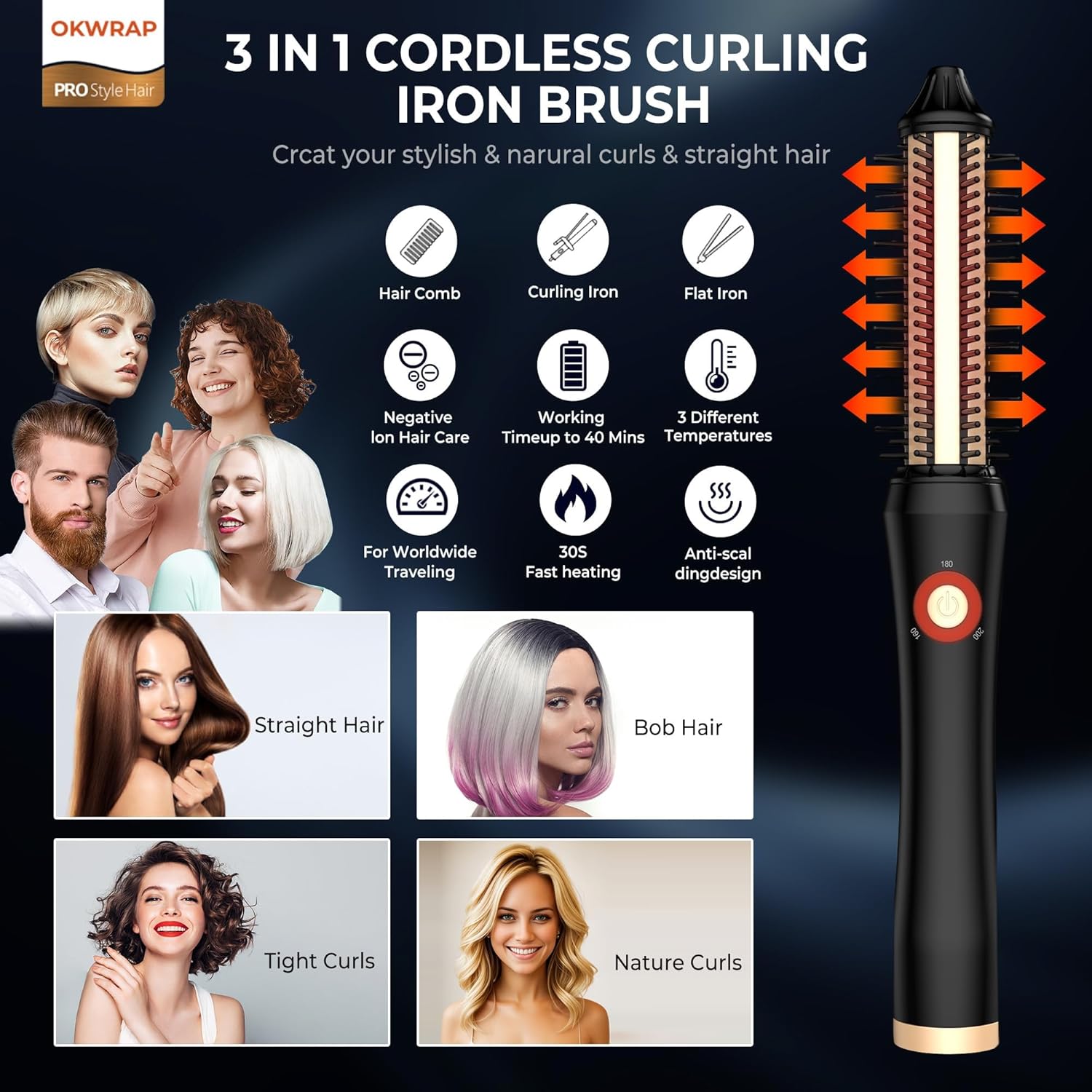 Draadloze Hot Brush ronde borstel, 38 mm, draadloze thermische borstel, thermische borstel, 3-in-1 stylingborstel met krultang, hot comb. Professionele draadloze warmteborstel voor op reis