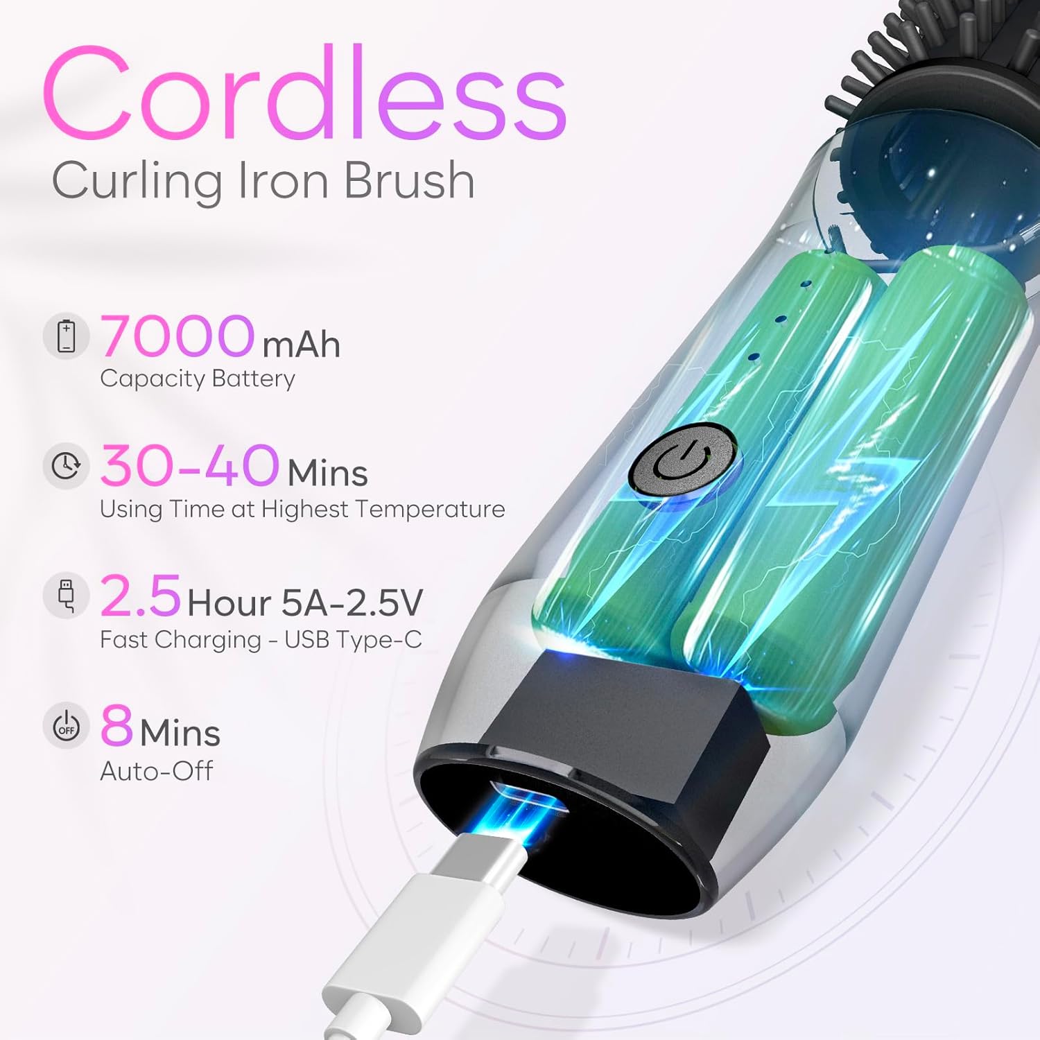 【Draadloos en draagbaar】: deze draadloze krultang heeft een draadloos ontwerp, waardoor hij compact en gemakkelijk mee te nemen is. Het werkt zonder dat er een stopcontact nodig is, zodat u uw haar gemakkelijk kunt stylen wanneer u onderweg bent. 【30s snelle verwarming】: de geavanceerde verwarmingstechnologie zorgt ervoor dat de krulstaafborstel snel opwarmt, hij kan snel een relatief hete temperatuur bereiken in 30 seconden. Probeer het niet met je handen aan te raken om brandwonden te voorkomen.Om echter een beter vormgevend effect te bereiken, is het het beste om geduldig te wachten tot de temperatuur de ingestelde temperatuur heeft bereikt voor gebruik. 【Batterij met hoge capaciteit】: met een ingebouwde 7000mAh batterij met hoge capaciteit, kan een volledige lading ongeveer 30 minuten worden gebruikt. Het is vooral handig voor op reis. Negatieve ionenhaarverzorging: deze krultang is uitgerust met ionische technologie en geeft tijdens het gebruik negatieve ionen af, wat statische en kroezen kan helpen verminderen, waardoor je haar mogelijk gladder en glanzender wordt. 【Vier temperatuurinstellingen】: met vier instelbare temperatuurinstellingen is deze draadloze krulborstel geschikt voor verschillende haartypes en stylingbehoeften, waardoor je de flexibiliteit hebt om je gewenste kapsel te creëren.