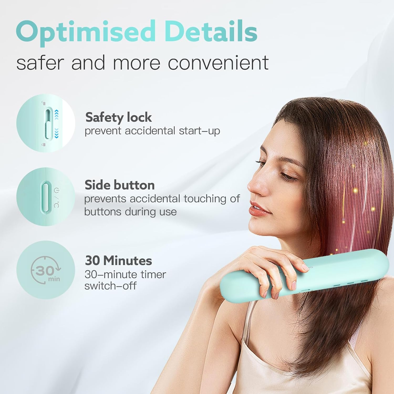 Veiligheid van gebruik: Veiligheidsvergrendeling aan de zijkant om per ongeluk starten van het apparaat te voorkomen; 30 minuten uitschakeltimer om te voorkomen dat je vergeet de mini-haarborstel uit te schakelen; knop aan de zijkant om onbedoelde aanrakingen tijdens het gebruik te voorkomen. Onze draagbare stijlborstel zorgt niet alleen voor langdurige gladmakende resultaten, maar is ook veilig in gebruik.