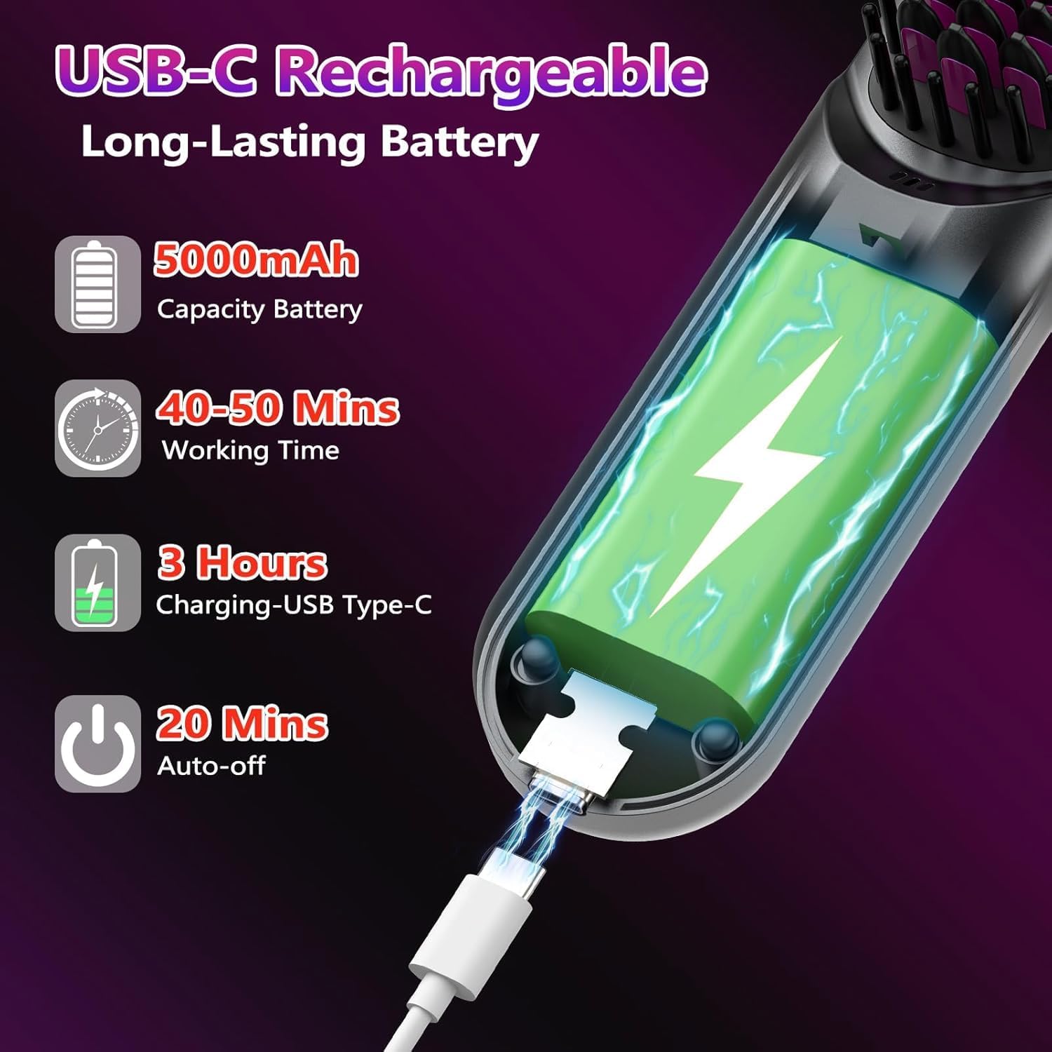 3 keer constante verwarming: onze draadloze hete borstel heeft 3 temperaturen om uit te kiezen, 160 ℃, 180 ℃, 200 ℃, je kunt hem vrij aanpassen aan je haartype en stylingbehoeften. De keramische verwarmingsplaat maakt gebruik van constante temperatuurverwarmingstechnologie, nauwkeurige temperatuurregeling om ervoor te zorgen dat de temperatuur van het gehele kamoppervlak gelijkmatig en stabiel is, waardoor oververhitting wordt vermeden en het haar beschadigd wordt. LCD-display geeft de temperatuur en het resterende vermogen aan