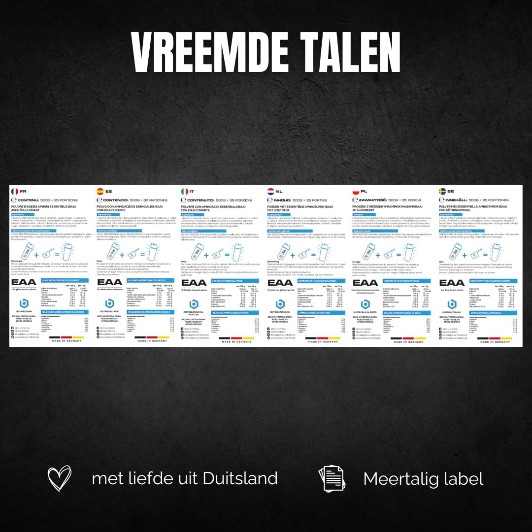 EAA poeder IJS THEE PERZIK 500gr – essentiële aminozuren – 11gr eiwit per portie – zonder nare nasmaak – veganistisch & hooggedoseerd – BIOS Nutrition (Gemaakt in Duitsland)
