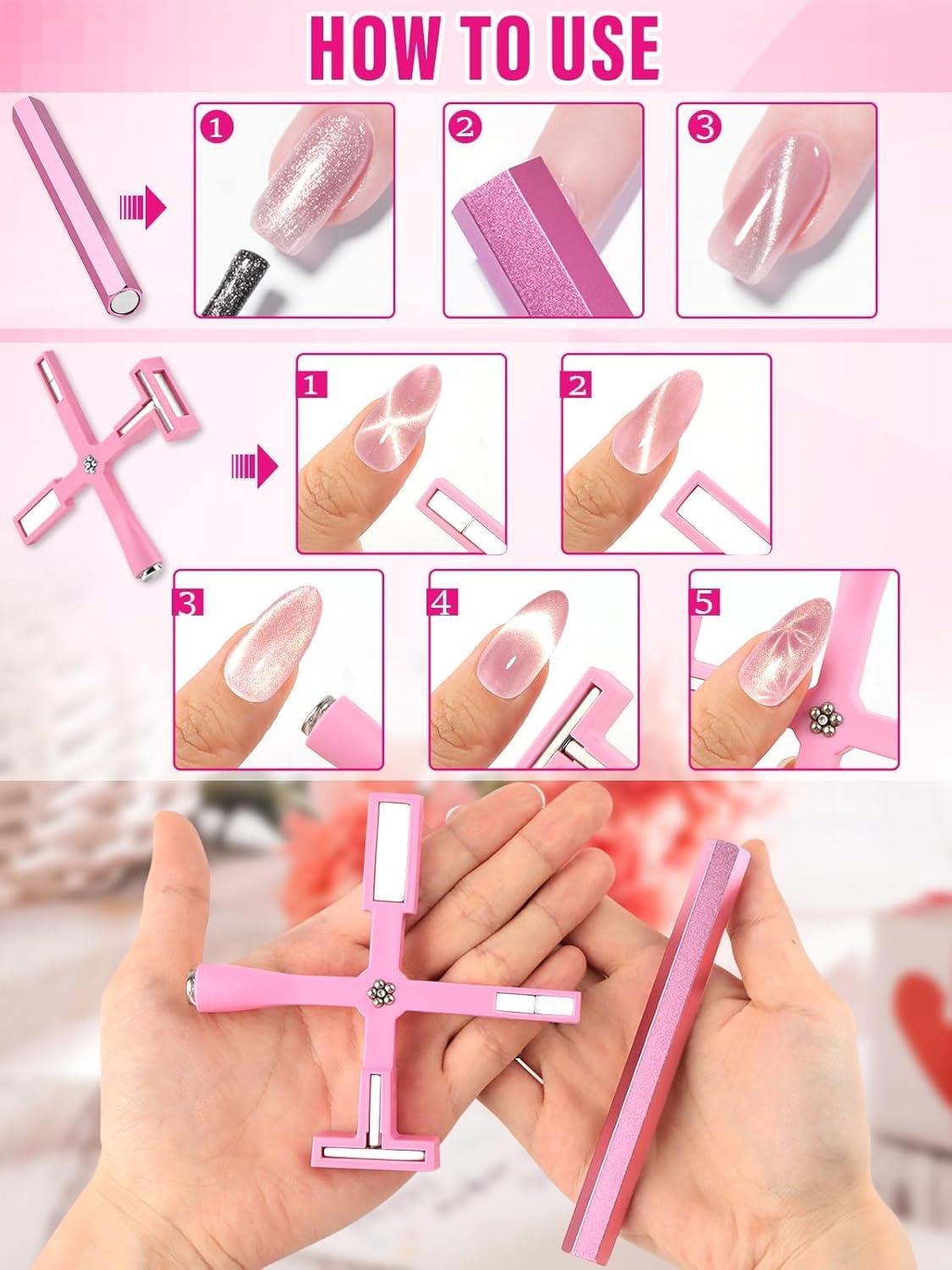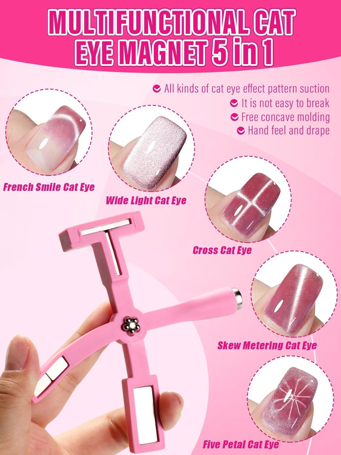 【Cat Eye Nail Art eenvoudiger en handiger】 Wij bieden twee soorten kattenoogmagneetgereedschappen, waaronder een verbeterde multifunctionele 5-in-1 kattenoogmagneet met 5 verschillende magnetische koppen. Elke kop kan aan uw verschillende nagelverbeteringsbehoeften voldoen en biedt verschillende verschijningsvormen. overeenkomen met uw individuele stijl.