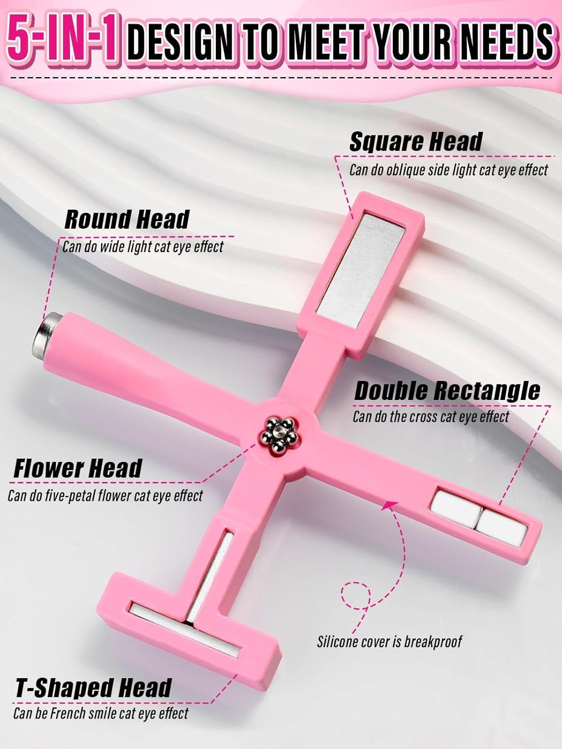 2,5-in-1 kattenoogmagneetgereedschap: de nagelmagneet heeft een geïntegreerd ontwerp van 5 verschillende magnetische koppen, waardoor het gemakkelijker wordt om van functie te wisselen, waardoor nail art eenvoudiger en handiger wordt, en is uitgerust met een siliconen hoes om breuk te voorkomen.