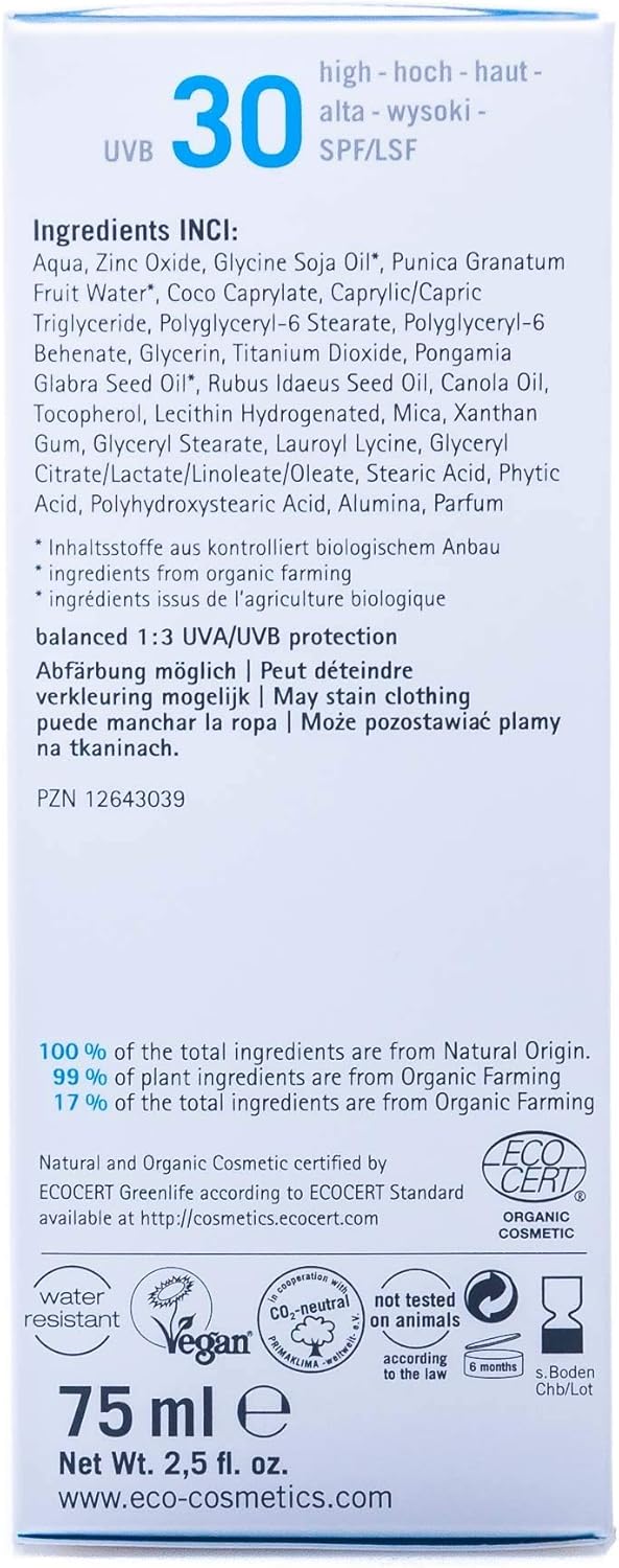 eco cosmetics eco zonnemelk 30+ sensitive, waterbestendig, veganistisch, zonder microplastic, natuurlijke cosmetica voor gezicht en lichaam, 1 x 75 ml