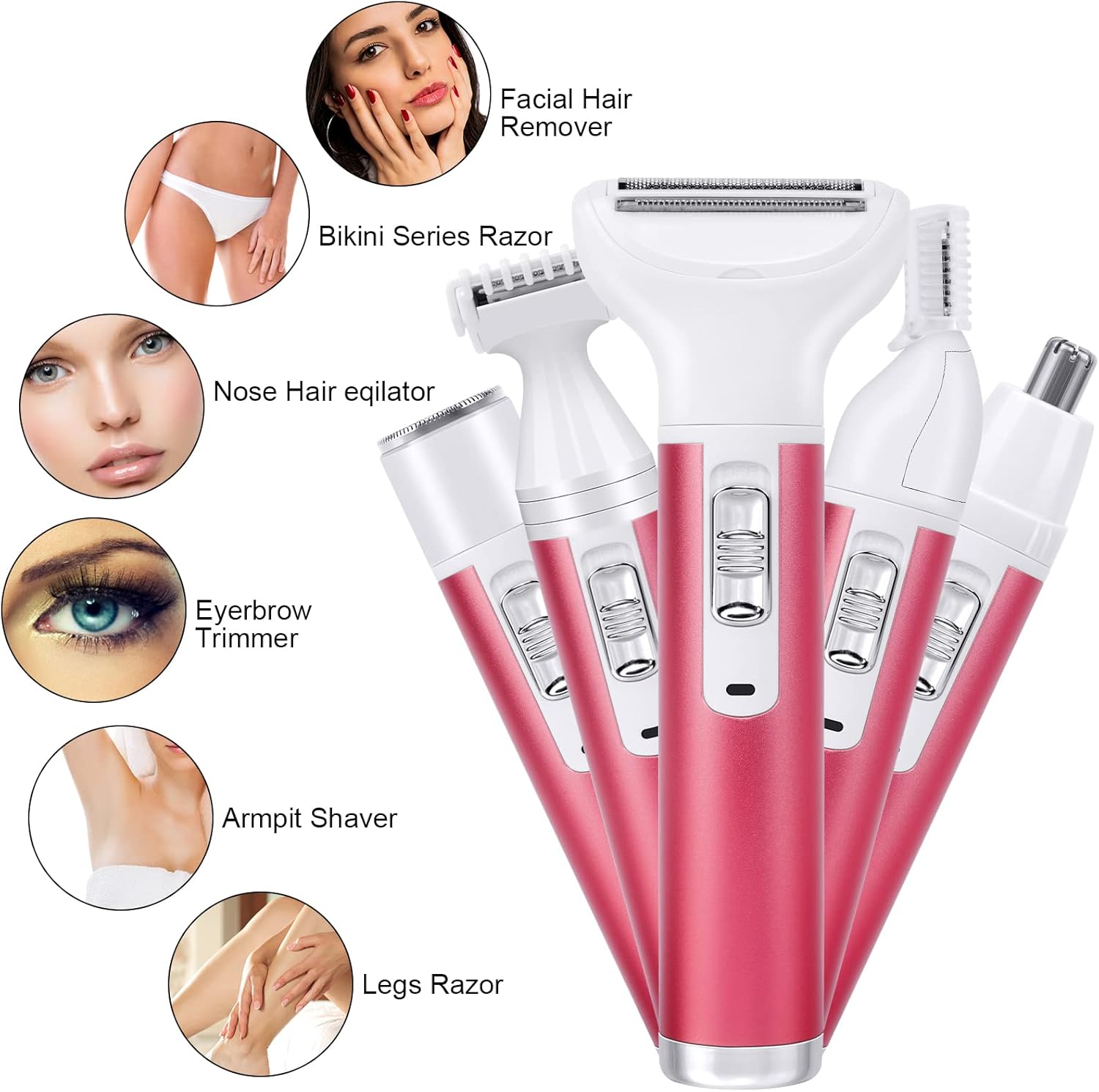 Elektrisch Ladyshave, 5-in-1 Draadloos Dames Elektrisch Scheerapparaat, Oplaadbaar Pijnloos Elektrische Epilator Bikinitrimmer Nat en Droog Ontharen voor Gezicht Benen Oksel, Neus, Armen, Bikinilijn en Wenkbrauw