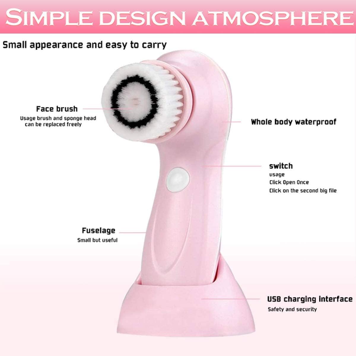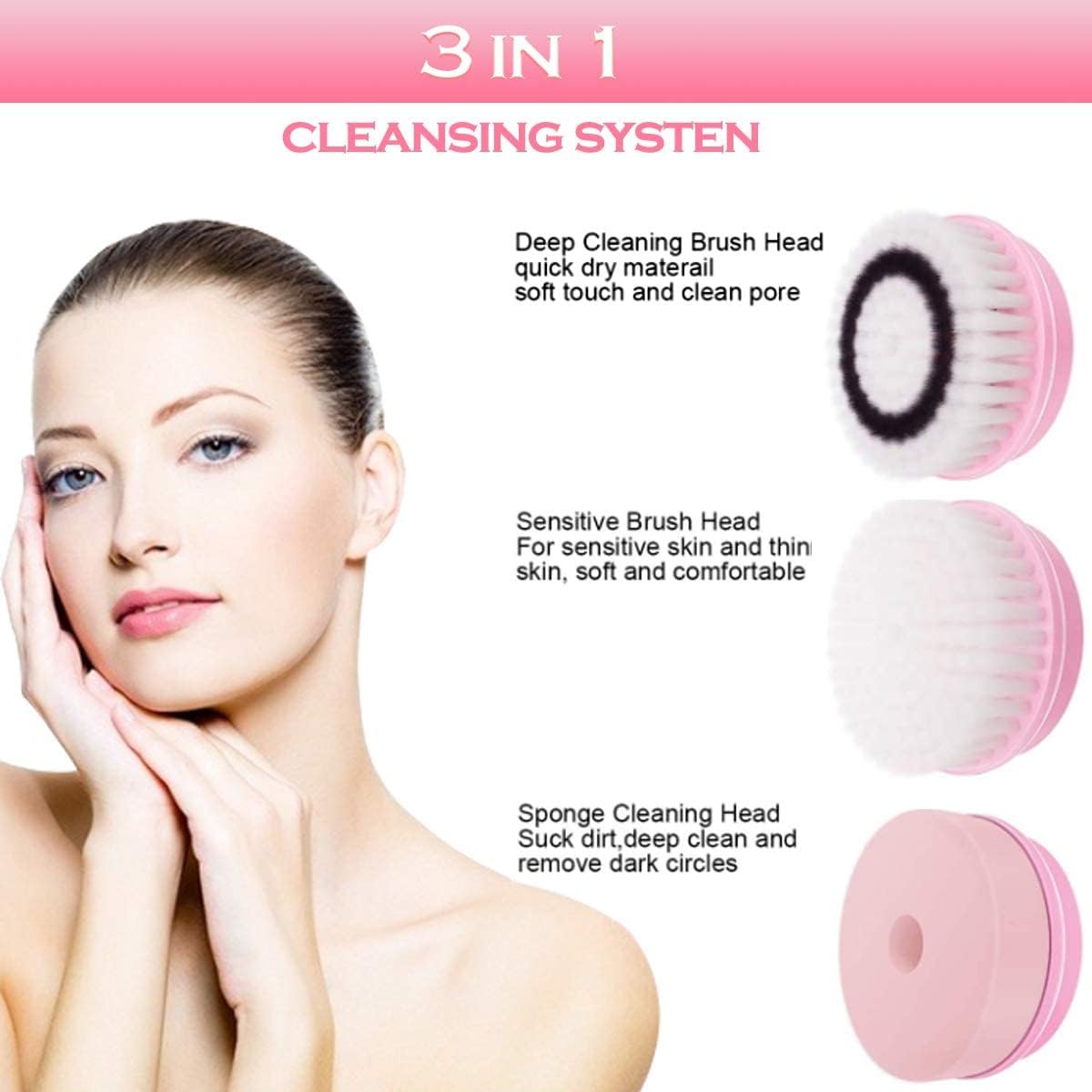 Elektrische gezichtsreinigingsborstel met USB-kabel, waterdichte gezichtsspin borstel met 3 borstelkoppen voor diepe reiniging, zachte peeling, verwijdering van mee-eters (roze)