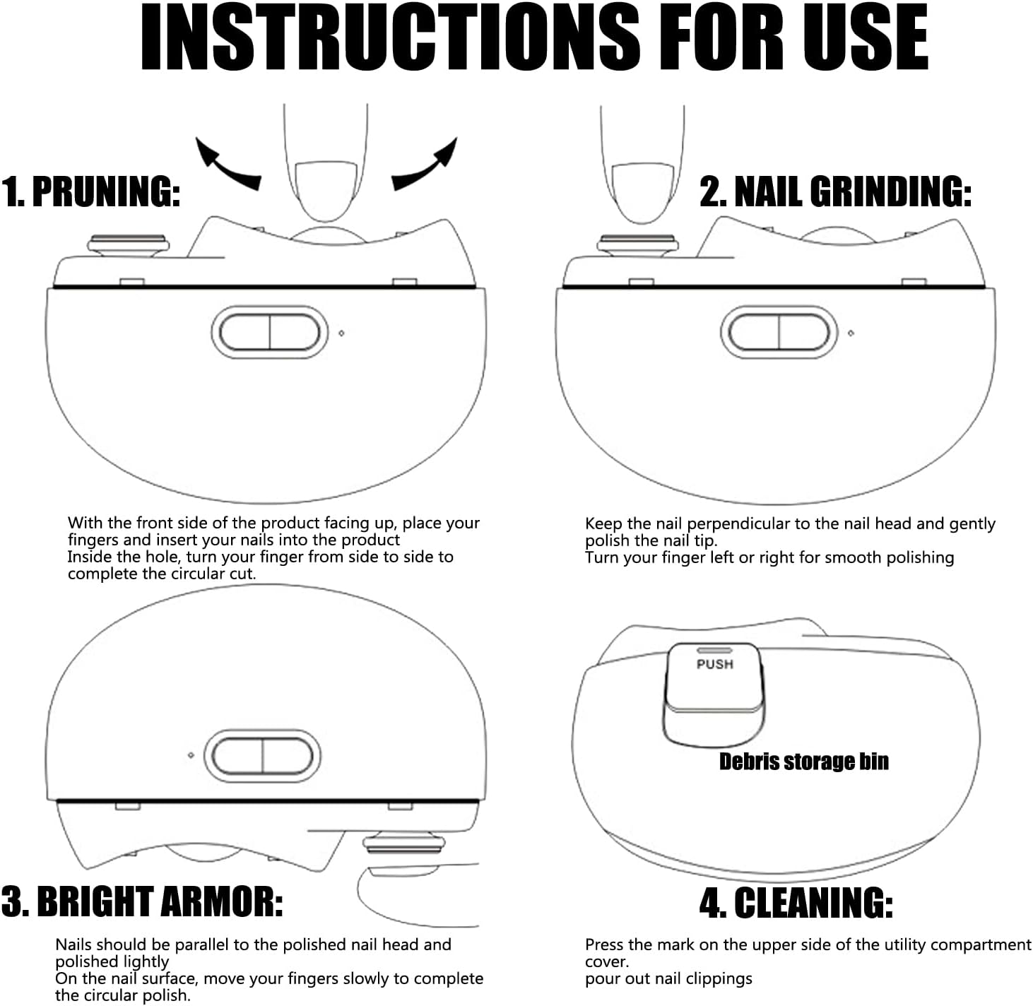 Veilig in gebruik: de elektrische nagelknipper beschikt over drie beschermlagen en het lemmet is binnenin verborgen. Als je vingers in direct contact komen met de nagelknipper, past de ergonomisch gevormde boog zich nauw aan de vorm van de nagel aan en je kunt je niet verwonden, ongeacht hoe je hem gebruikt. Je kunt je nagels zelfs in het donker met gesloten ogen knippen.