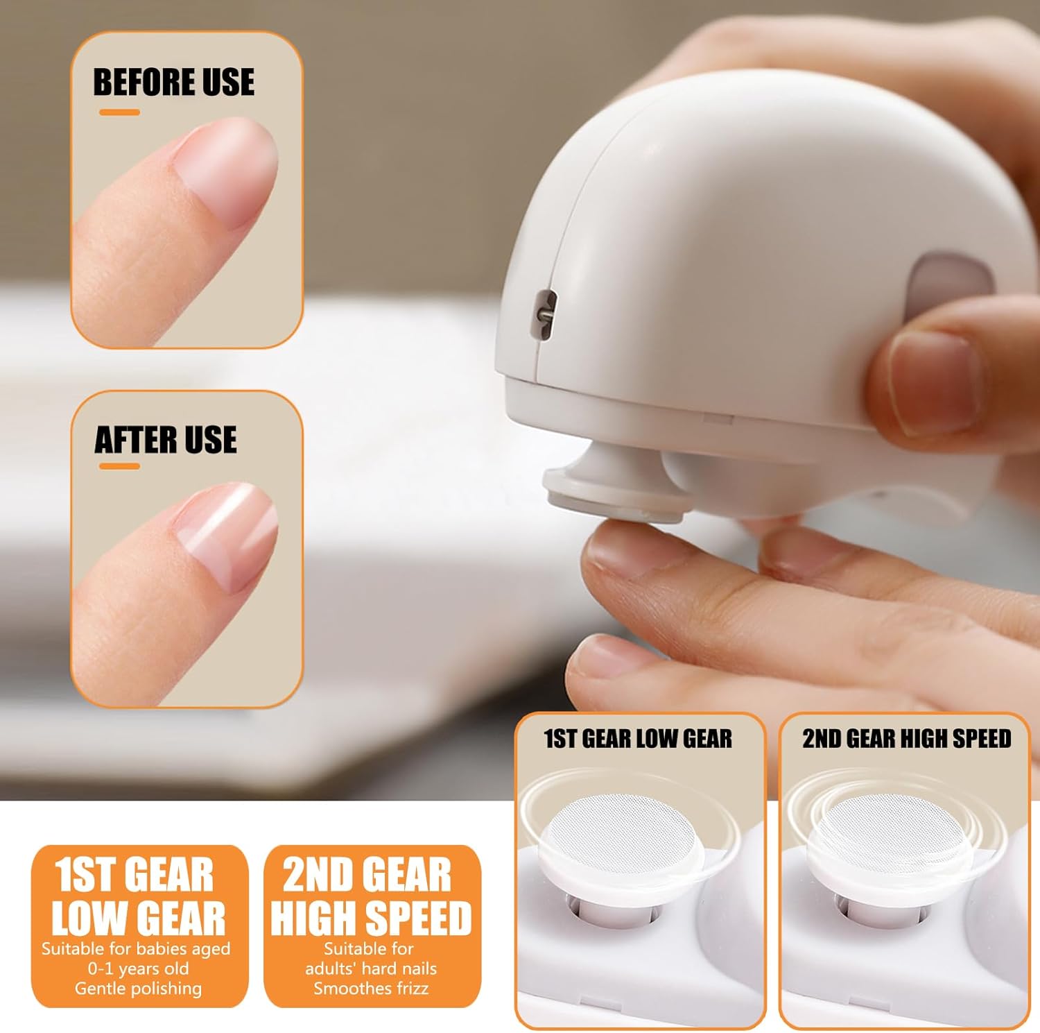 Oplaadbaar en geluidsarm: uitgerust met een 500 mAh batterij met hoge capaciteit, gebruikt type C-kabel (meegeleverd). De elektrische nagelknipper is klein en voortreffelijk, gemakkelijk te vervoeren en op te bergen en kan op reis worden meegenomen. Uitgerust met een geluidsarme motor is de snelheid stabiel en de trillingen laag, zodat slapende kinderen niet gestoord worden en het nagelknippen wordt vergemakkelijkt.
