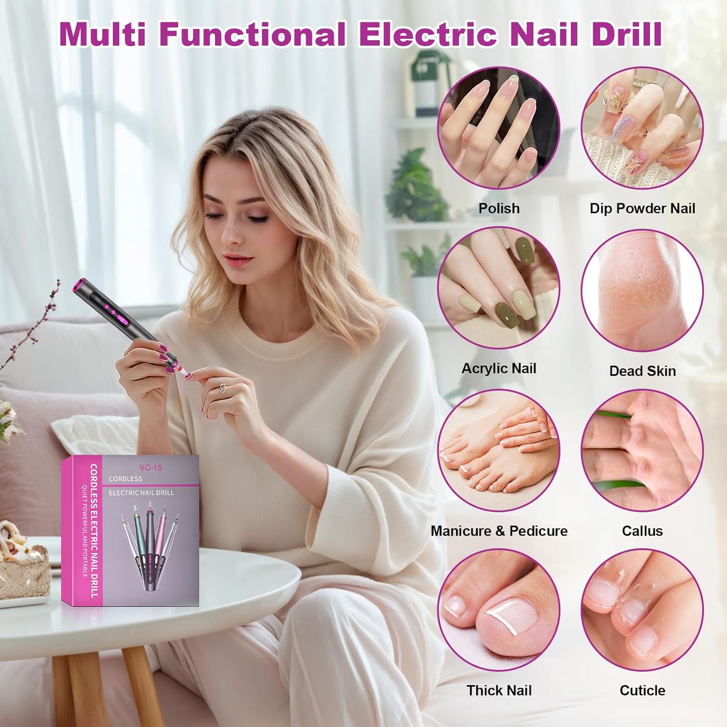 Draadloze draagbare elektrische nagelvijl: deze nagelvijl is uitgerust met een oplaadbare batterij, kan worden gebruikt voor slijpen, knippen, snijden, polijsten zonder draad. De acrylnagelboor met type-C oplaadkabel, volledig opgeladen gedurende 2 uur, heeft een manicuretijd van maximaal 4,5-6 uur. Compact en lichtgewicht (98 g) ontwerp maakt het gemakkelijk te dragen, je kunt je nagel altijd en overal vijlen.