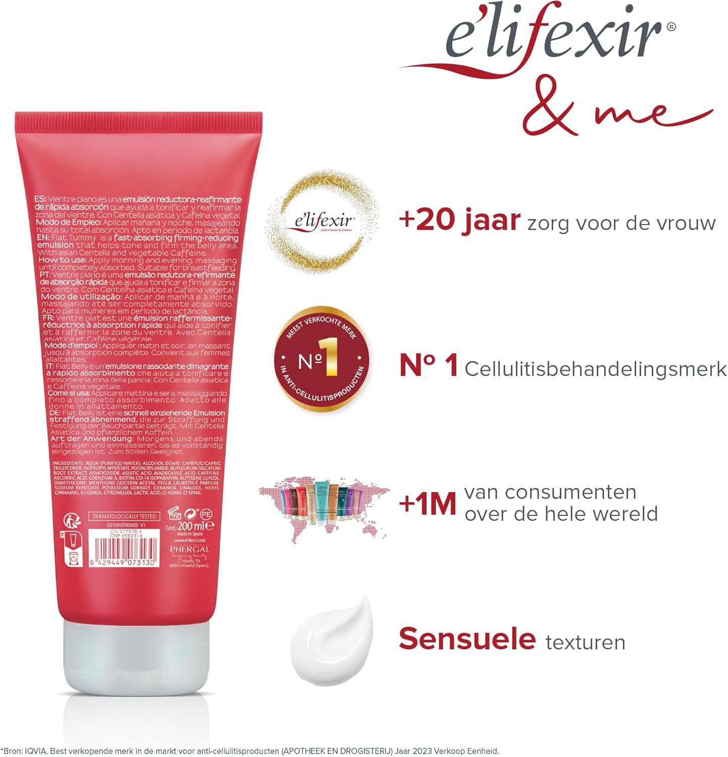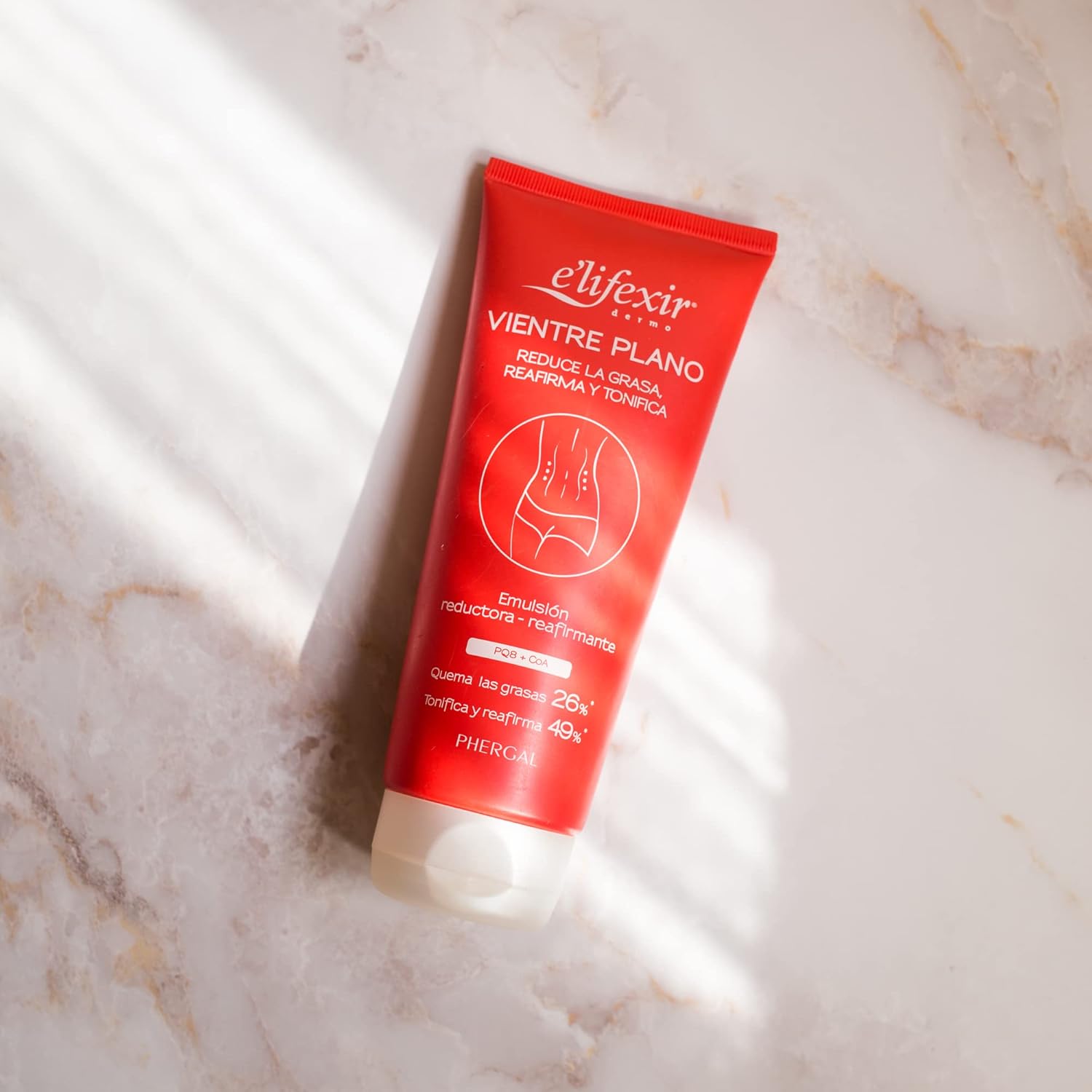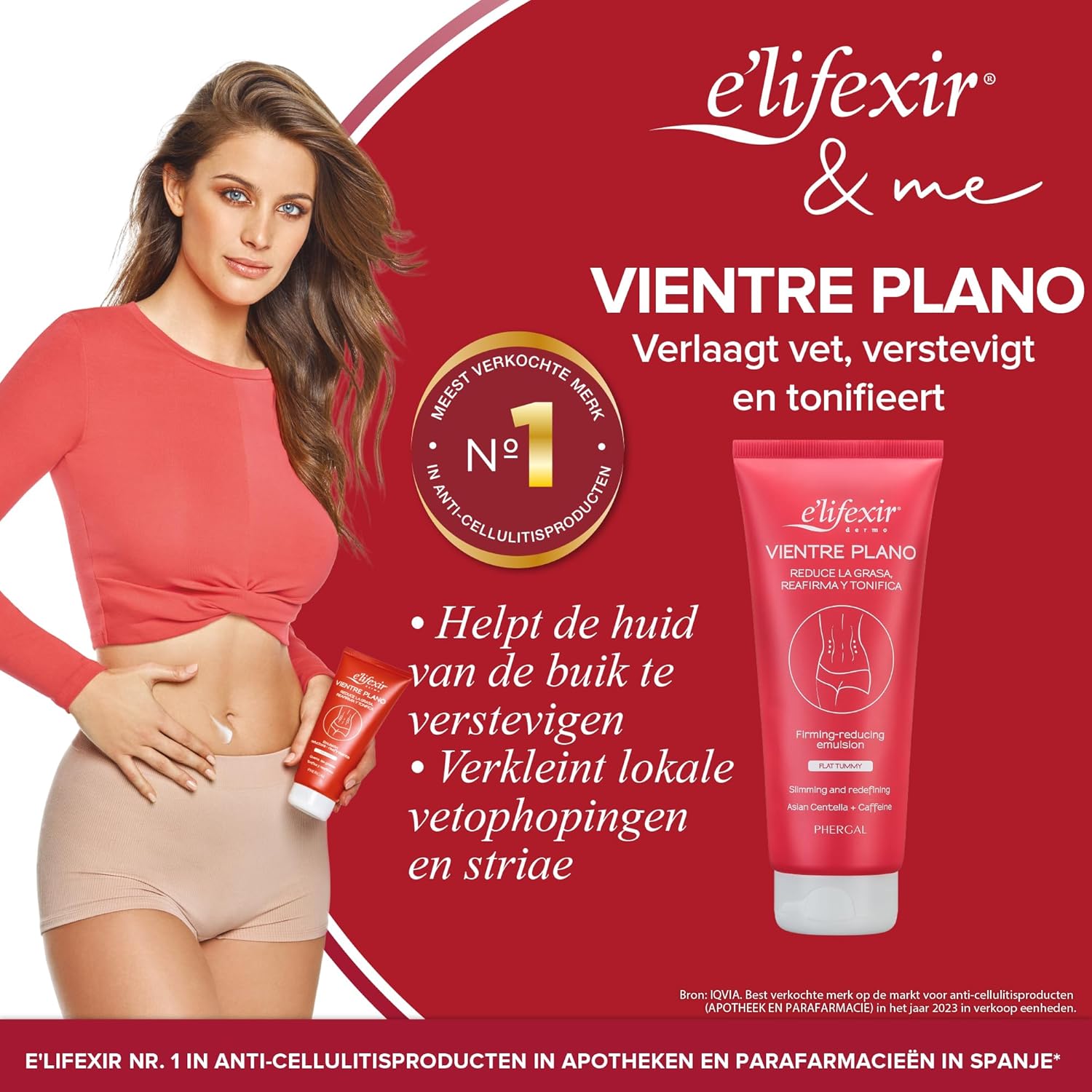 ELIFEXIR VIENTRE PLANO. Het is een krachtige vetverbrandende emulsie die snel wordt opgenomen en je helpt een platte, stevige en getoonde buik te tonen. Het helpt de verslapping van het buikgebied te bestrijden, vermindert lokale vetophopingen en striae, en herstelt de stevigheid van de huid.